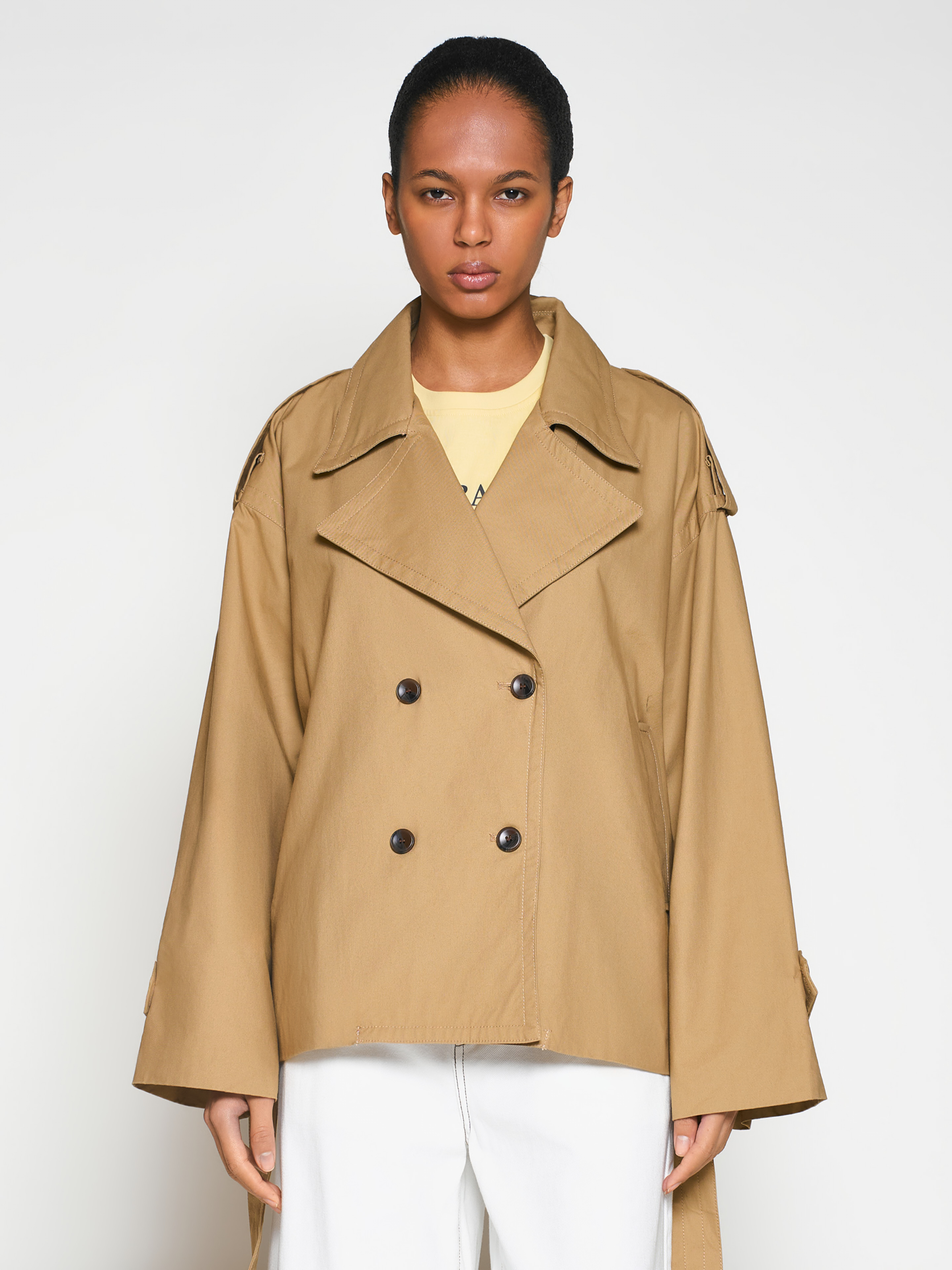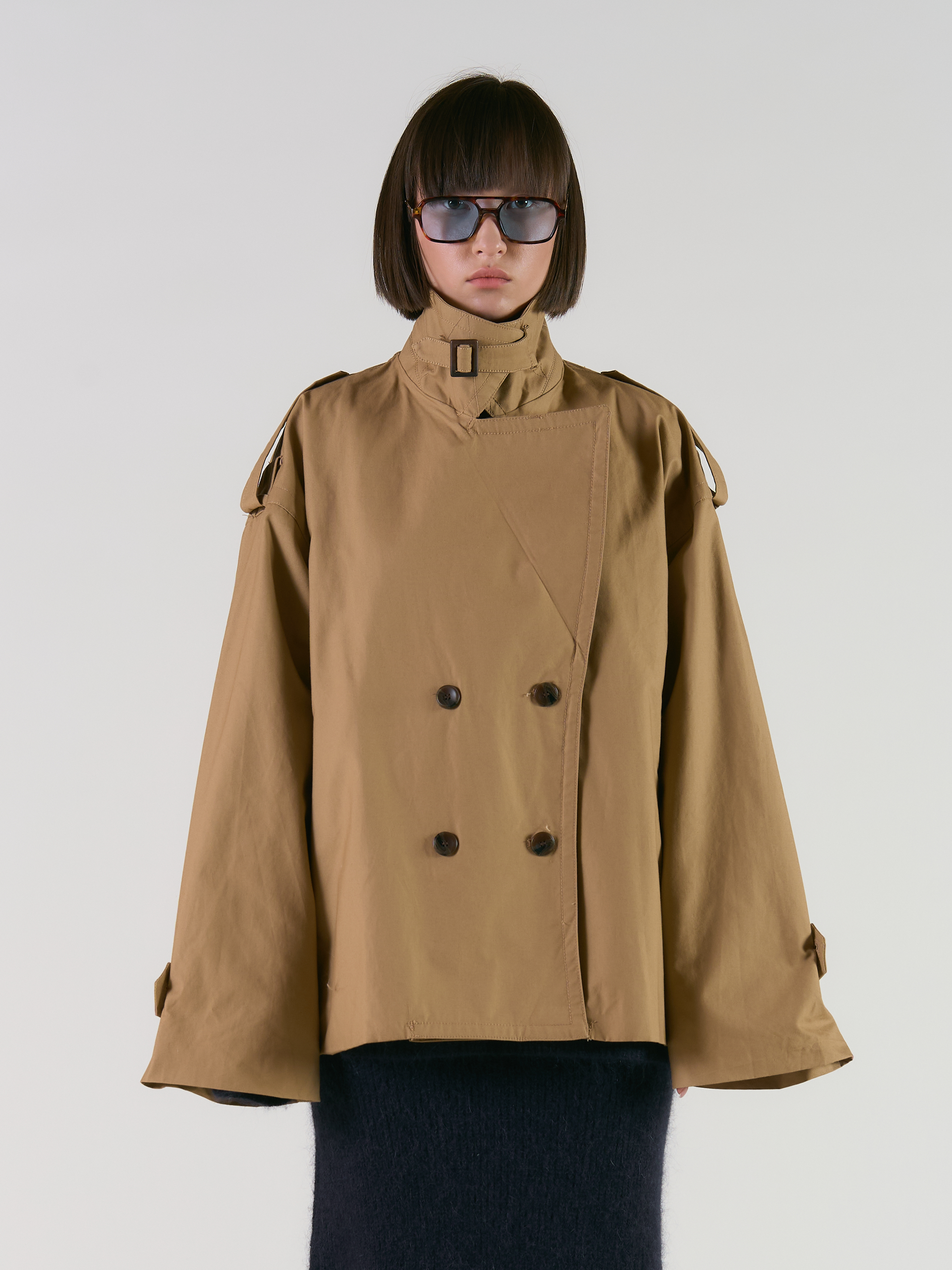Укороченный двубортный тренч Sharp оверсайз кроя с акцентными лацканами. Благодаря своему крою воротник можно поднять и закрепить с помощью ремешка, также на рукавах есть регулируемые хлястики. А для создания более элегантного силуэта есть пояс, которым можно подчеркнуть талию и создать новые формы. Два боковых прорезных кармана и один внутренний. Параметры модели Рост: 164 см Грудь - 85 см, талия - 63 см, бедра - 93 см Размер на модели: ONE SIZE