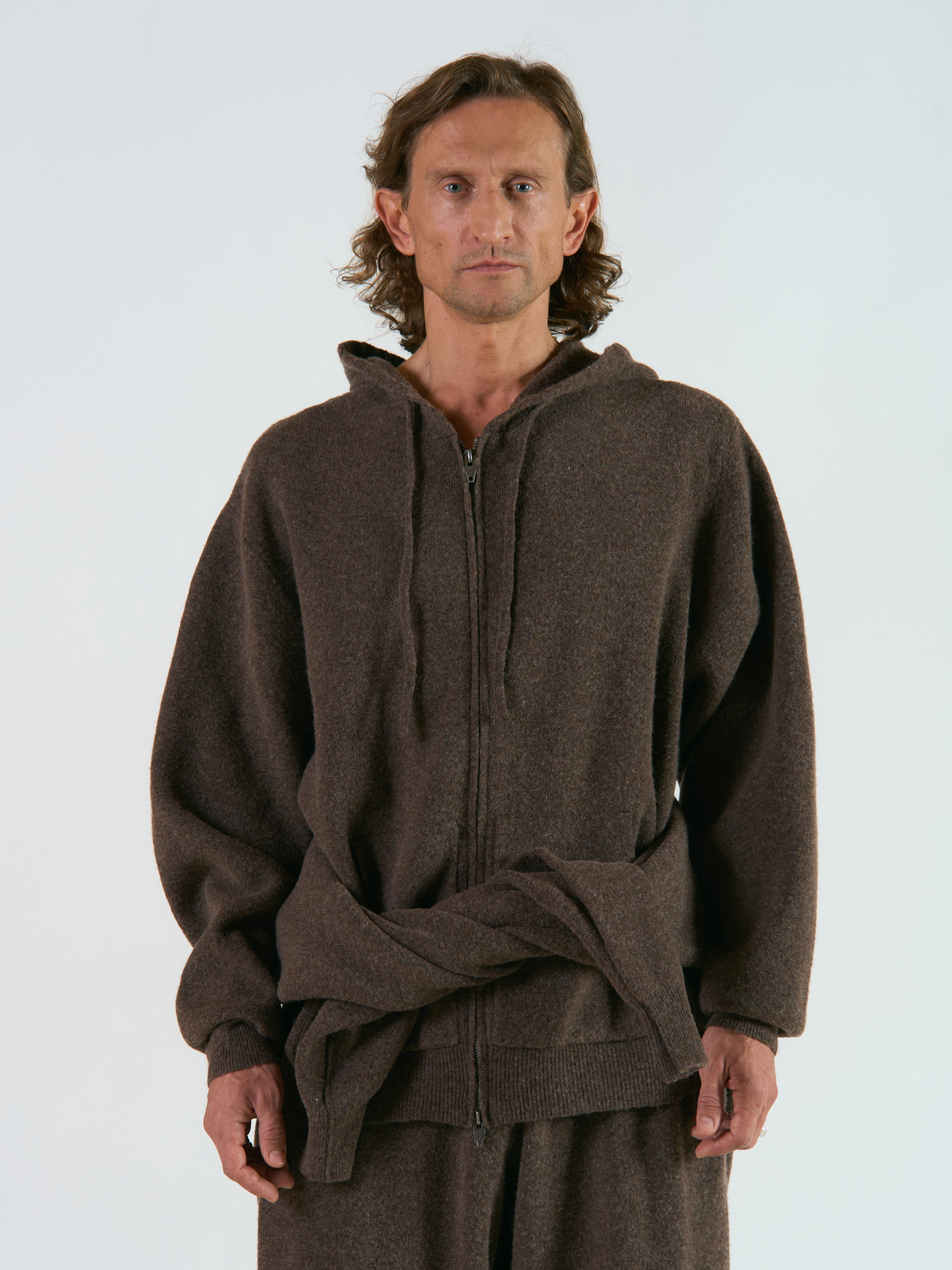 Вязанное худи Nordic свободного кроя. Капюшон с кулисками, тип застежки — скрытая молния. На передней части расположены два накладных кармана. Модель выполнена из мягкой 100% шерсти (Ошибка производства в вшивном ярлыке составника). Которая обеспечит тепло и комфорт в холодные дни. Отдельно можно приобрести вязанные брюки Nordic для создания полноценного костюма. Параметры модели Рост: 180 см Грудь - 90 см, талия - 75 см, бедра - 87 см Размер на модели: L