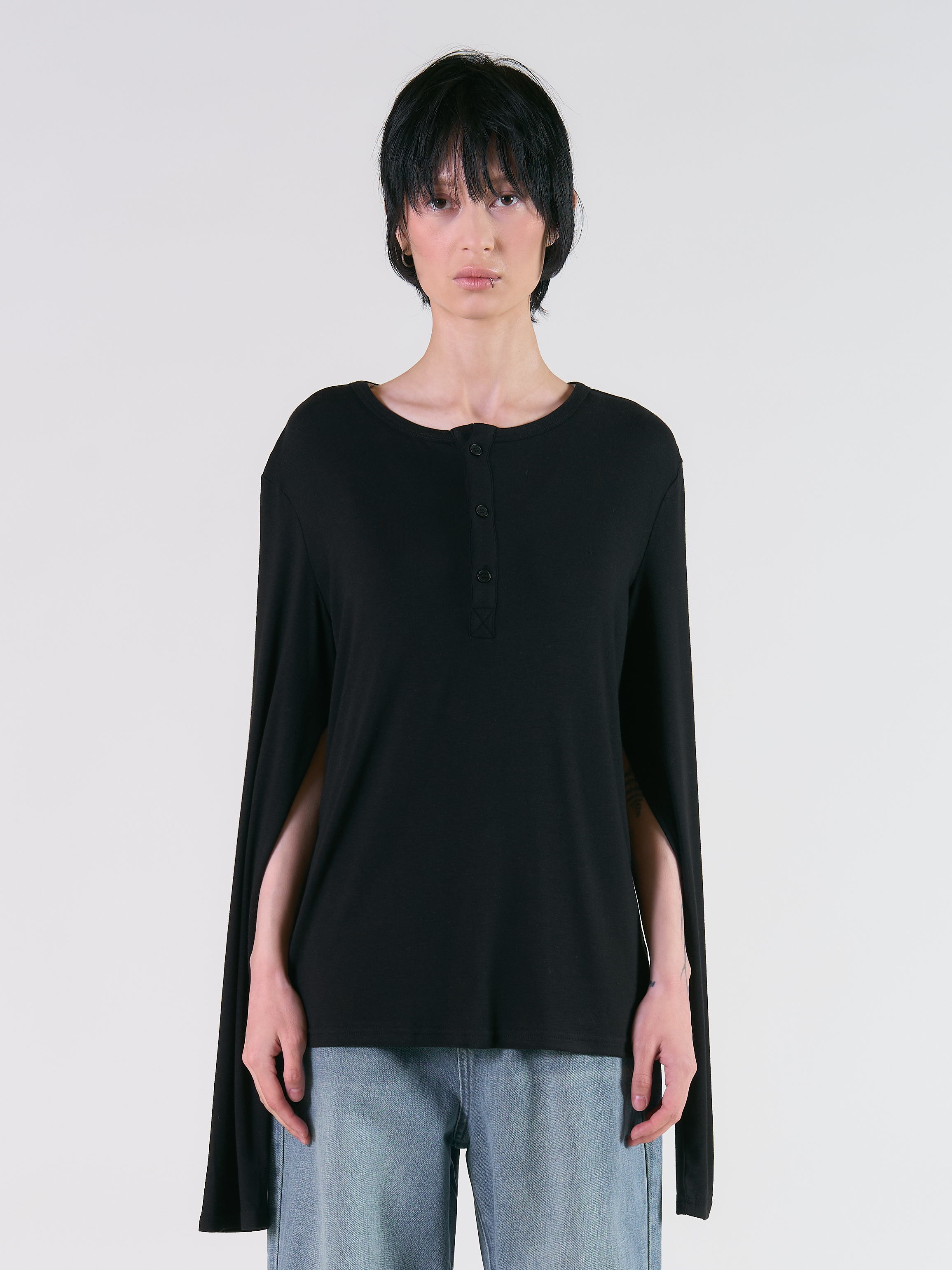 Лонгслив Avant Cape свободного кроя, с пуговками до середины груди. Главная особенность — это сочетание базового, повседневного лонгслива с более вечерним и элегантным вариантом. Благодаря внутренним рукавам-кейпам. Модель выполнена из смесовой струящейся ткани. Параметры модели Рост: 170 см Грудь - 83 см, талия - 56 см, бедра - 84 см Размер на модели: S