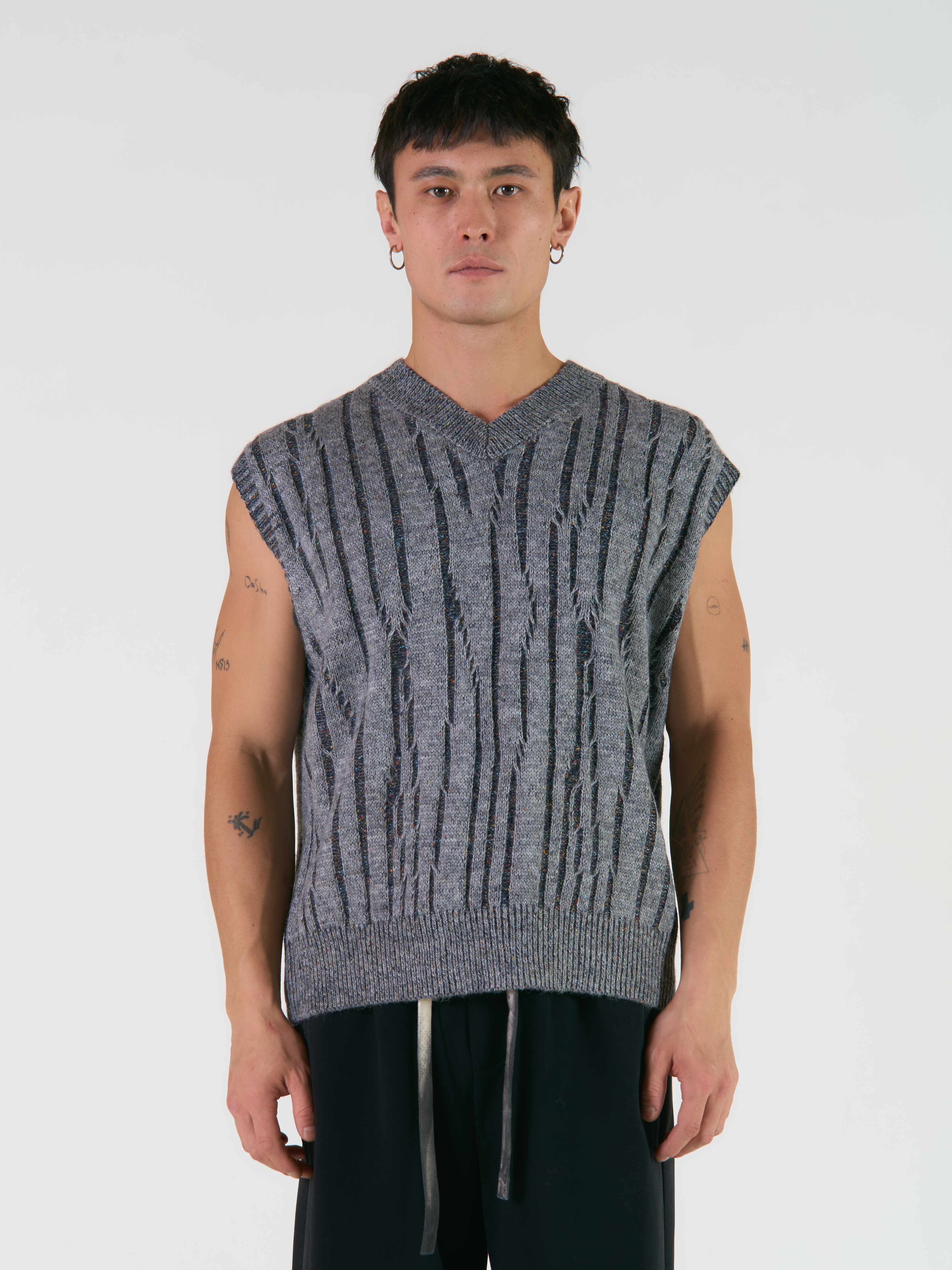Жилет Сrack свободного кроя, с V-образным вырезом. Изделие выполнено из смесовой пряжи с добавлением шерсти. Цвет получился неоднородным благодаря различным вкраплениям в материале. Параметры модели Рост: 180 см Грудь - 90 см, талия - 75 см, бедра - 87 см Размер на модели: М