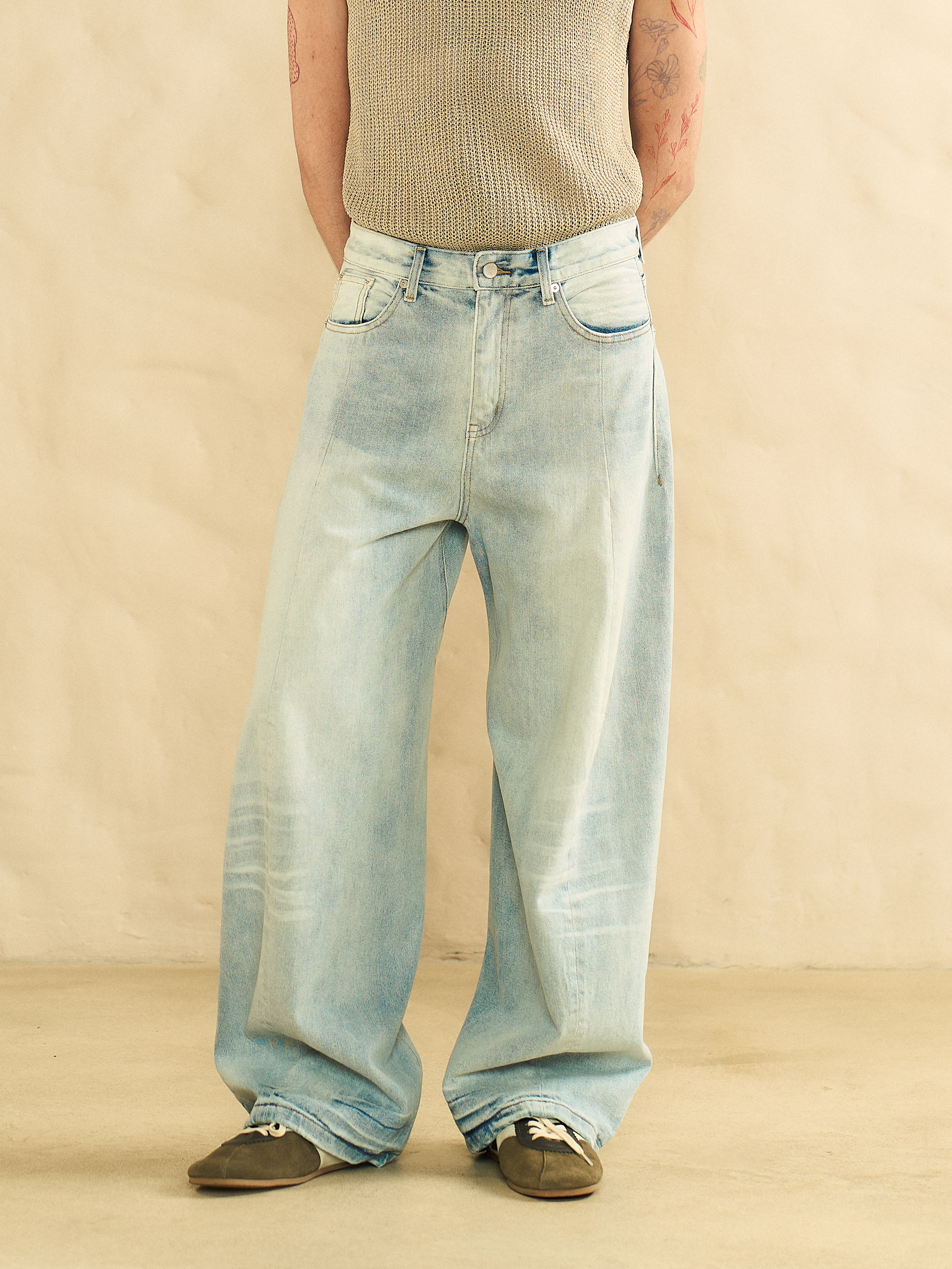 Джинсы Sky Blue свободного фасона. Уникальны своим кроем, у них отсутствуют боковые внешние швы, которые перенесены на переднюю часть для создания большего объема. Модель выполнена из вареного денима, поэтому окрас материала получился неоднородным и неповторимым. При этом данная пара будет незаменима в вашем гардеробе благодаря своей универсальности. Два передних прорезных кармана и два задних накладных. Есть шлевки для ремня.