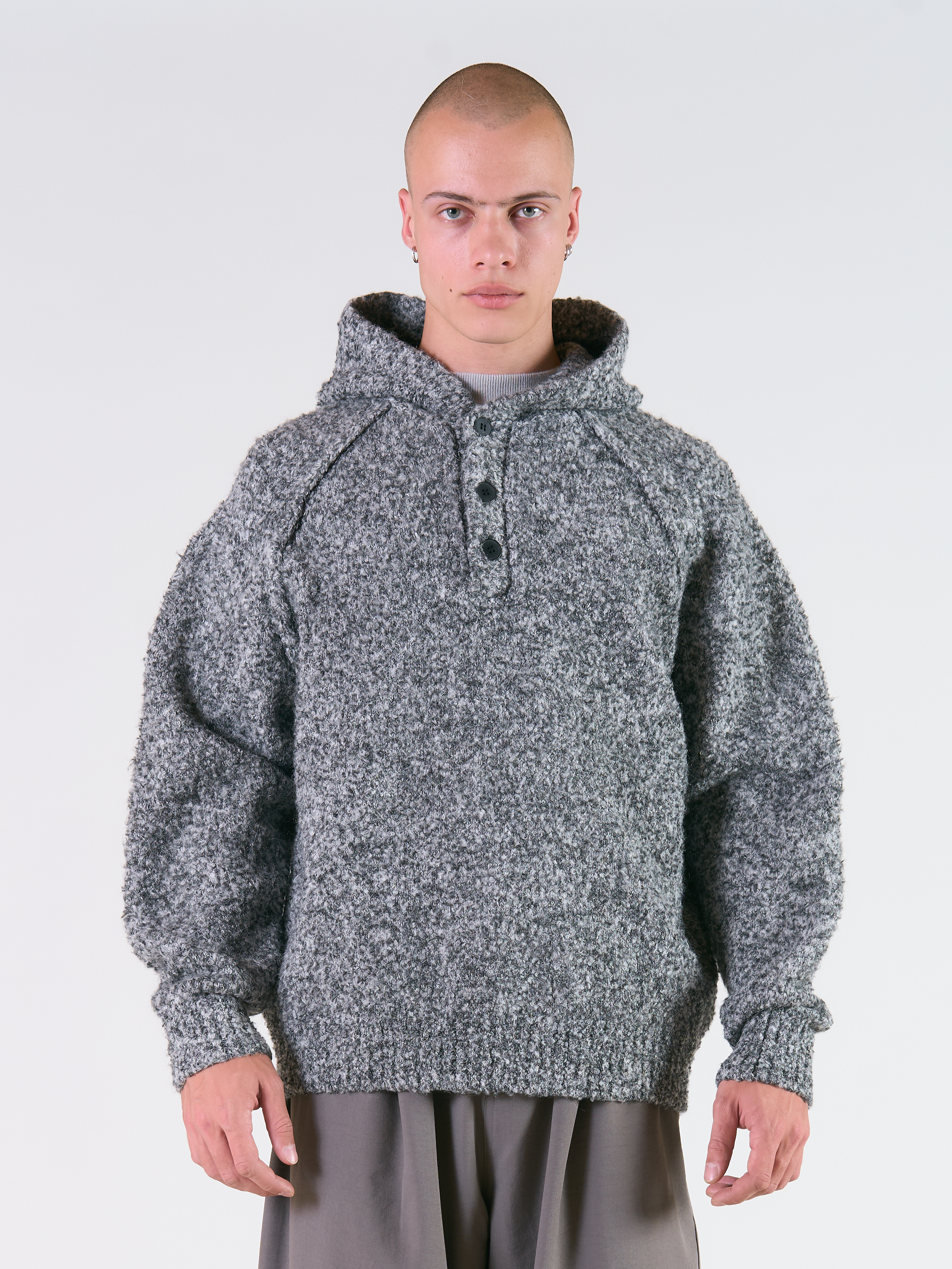 Свитер с капюшоном Textured свободного кроя, с акцентными пуговицами до середины груди. Мы решили совместить две незаменимые вещи холодного сезона — это худи с капюшоном и свитер. Который благодаря своему составу будет согревать и дарить комфорт. Для этой модели мы подобрали смесовую пряжу с неоднородным оттенком серого, слегка пушистой фактурой. Параметры модели Рост: 184 см Грудь - 105 см, талия - 72 см, бедра - 91 см Размер на модели: L