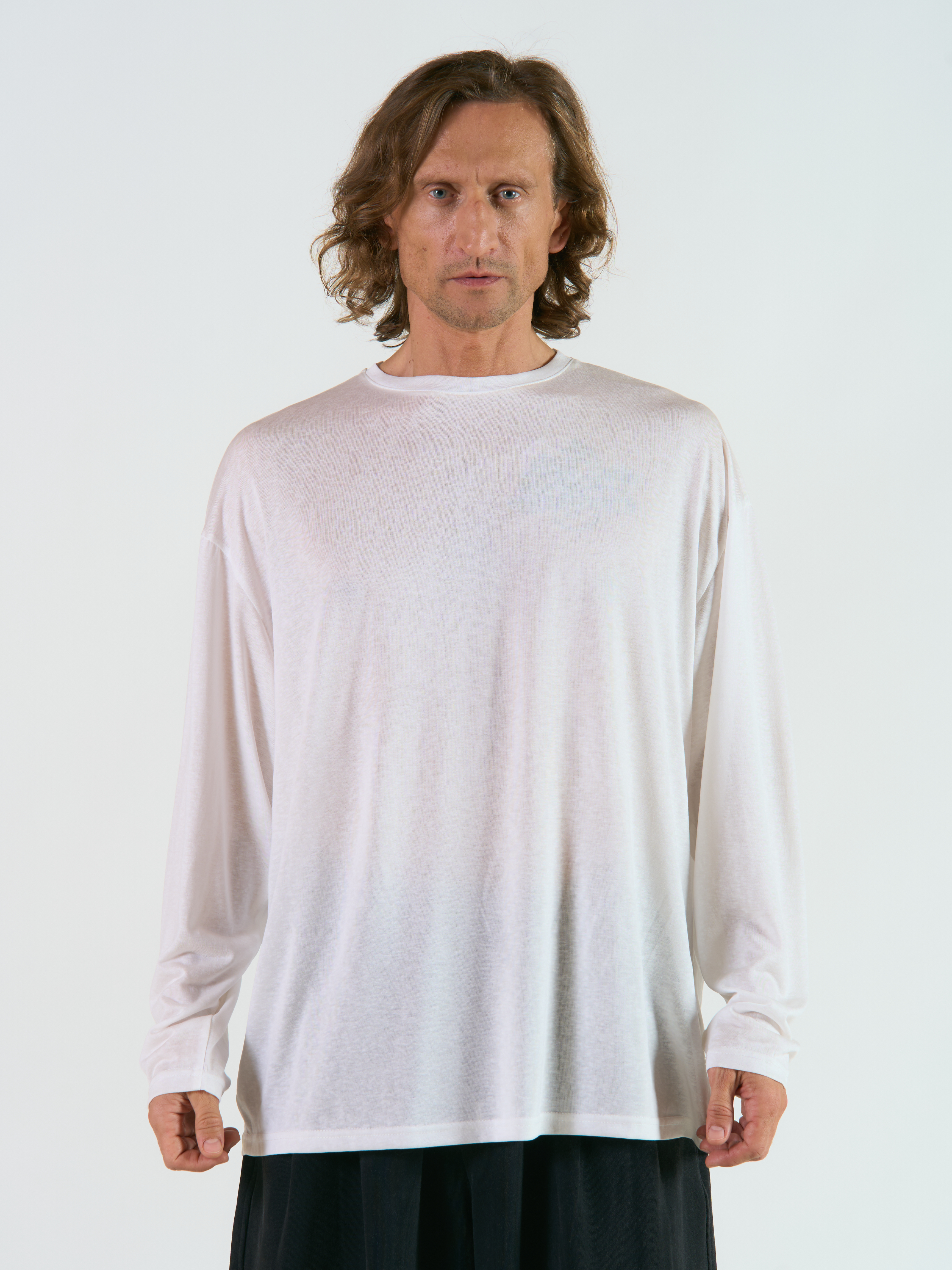 Лонгслив Alba свободного кроя. Рукава прямые и выполнены без манжетов. Выполнен из тонкой струящейся ткани. Данная модель станет хорошей базой для креативных и повседневных образов. Параметры модели Рост: 175 см Грудь – 90 см, талия - 70 см, бедра - 93 см Размер на модели: S