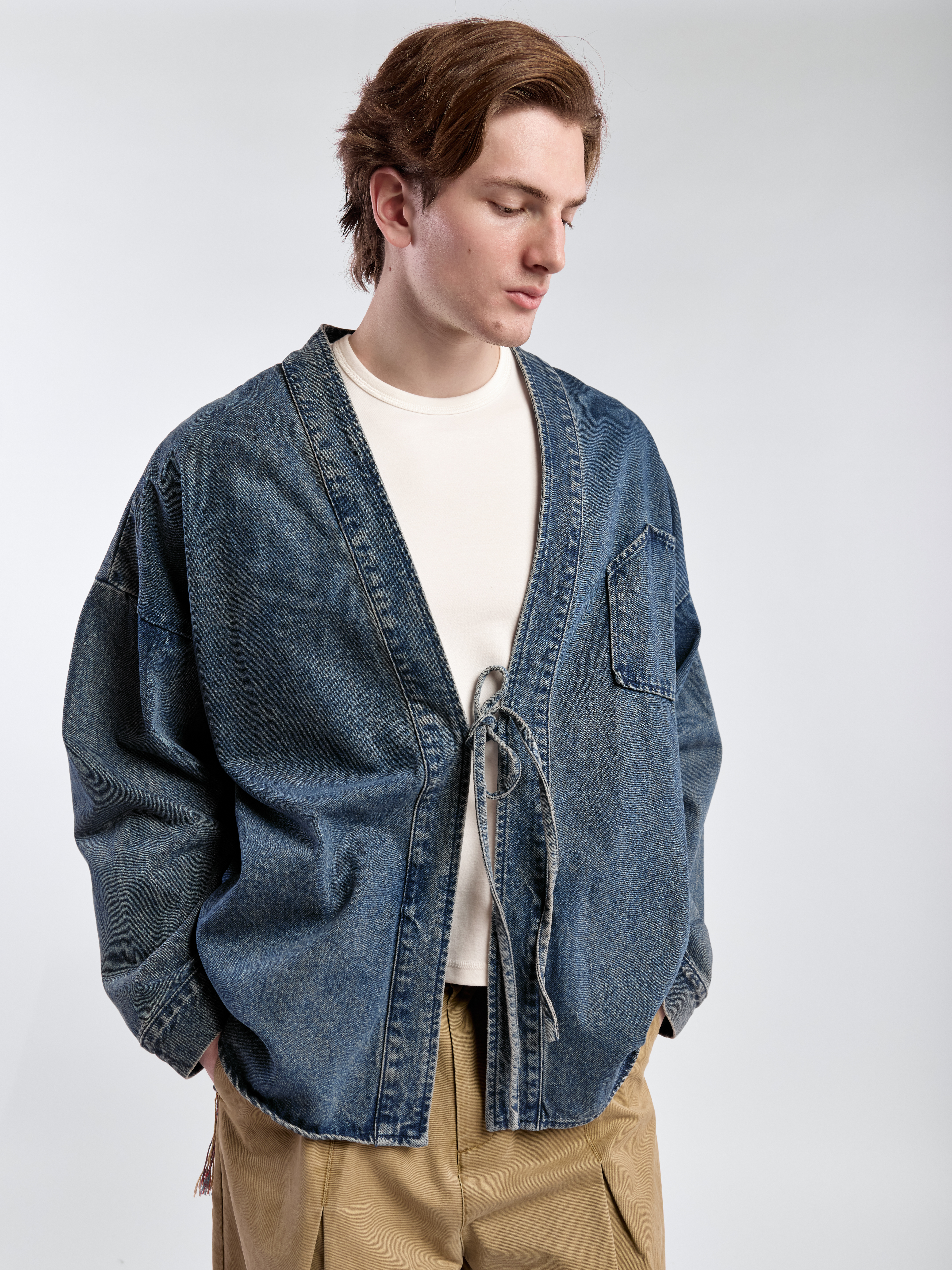Кимоно свободного кроя, с приспущенной линией плеча. Модель выполнена из джинсы средней плотности. Застегивается на завязки. На передней части один нагрудный карман и два боковых прорезных. Параметры модели: Рост: 188 см Грудь - 88 см, талия - 71 см, бедра – 90 см Размер на модели: L