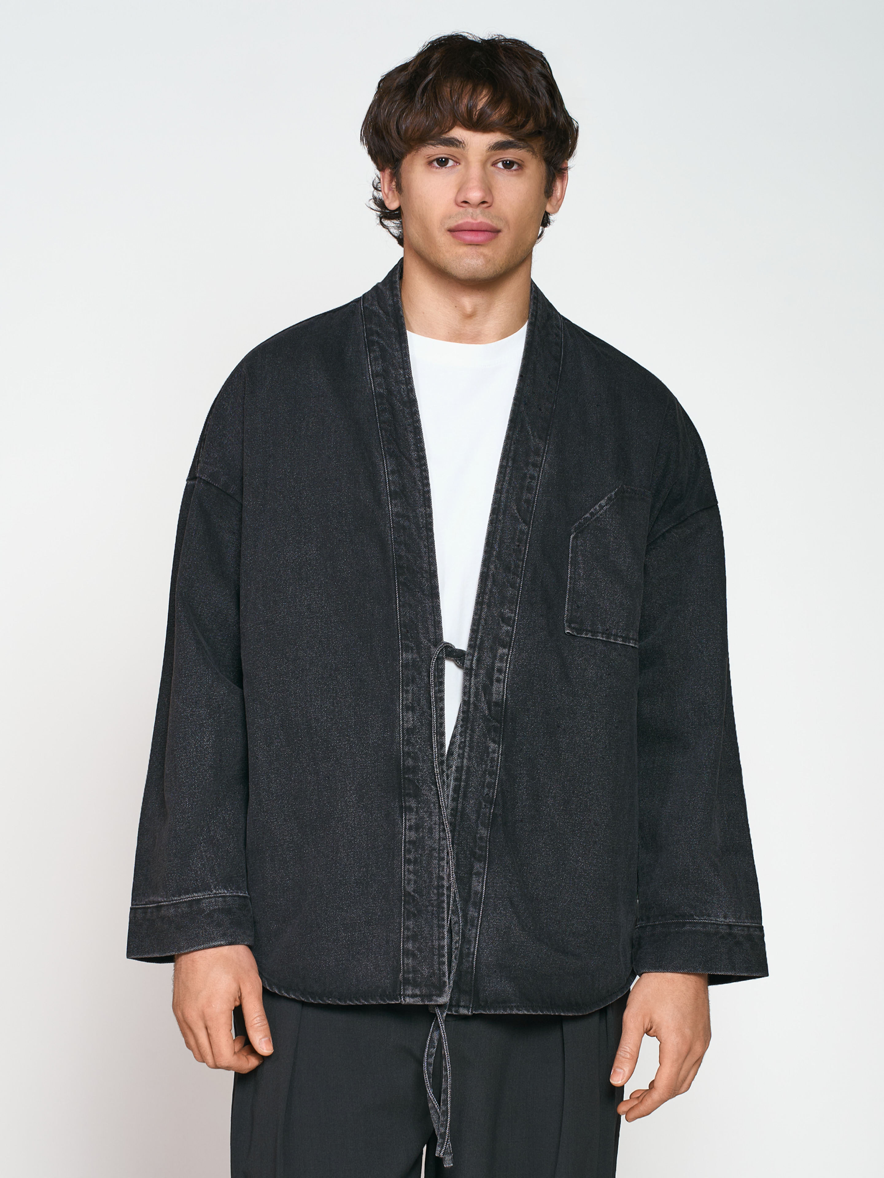 Кимоно джинсовое на завязке с накладным ассиметричным карманом. Боковые карманы спрятаны в боковые швы, что придает изделию функциональность. Прекрасное дополнение к рубашке или свитеру. Параметры модели: Рост: 188 см Грудь - 88 см, талия - 71 см, бедра – 90 см Размер на модели: L