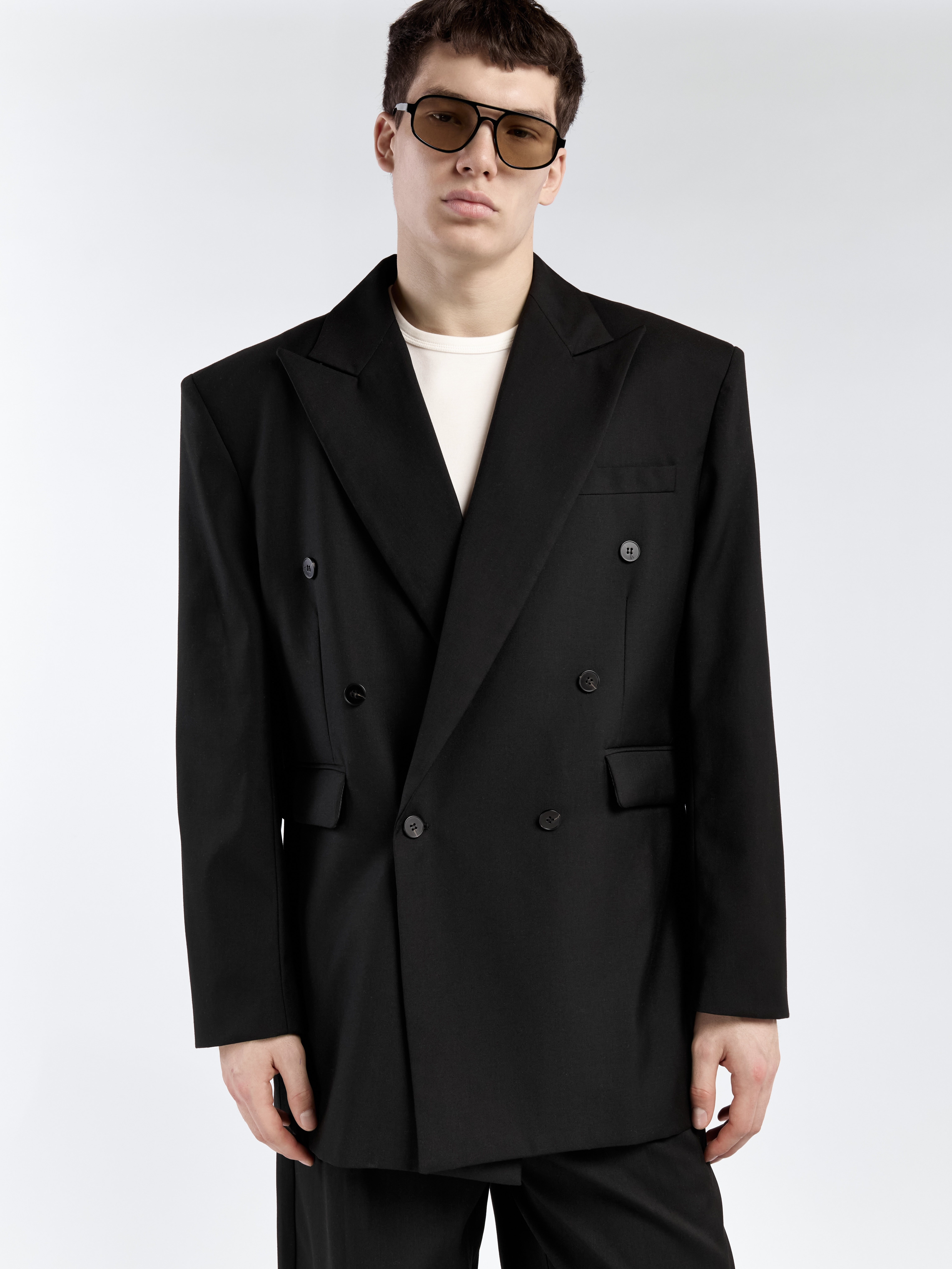 Двубортный пиджак свободного кроя, с акцентными плечами и удлиненного силуэта. Изделие выполнено из смесовой костюмной ткани с гладкой фактурой. Два передних прорезных кармана и один внутренний. Для создания полноценного костюма отдельно можно приобрести костюмные брюки прямого кроя. Параметры модели Рост: 189 см Грудь – 99 см, талия - 82 см, бедра - 105 см Размер на модели: М