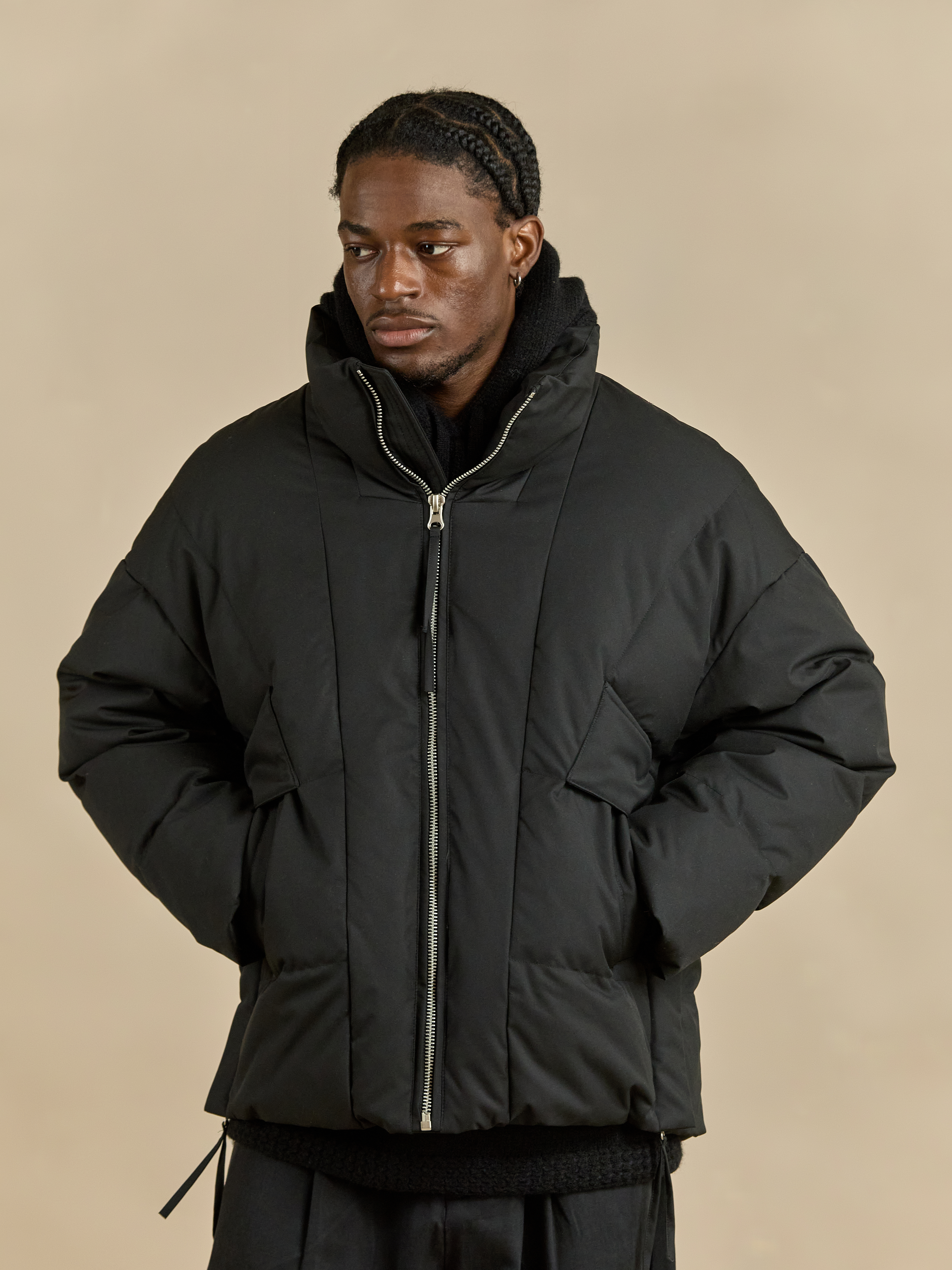 Стеганая куртка, из матовой фактурной ткани. Ворот-стойка, два прорезных кармана и один внутренний. Для более плотного прилегания к телу по бокам изделия присутствуют молнии с защитой от ветра и манжеты на рукавах. Белый утиный пух в качестве наполнителя. Можно носить до -15 градусов с теплым свитером.