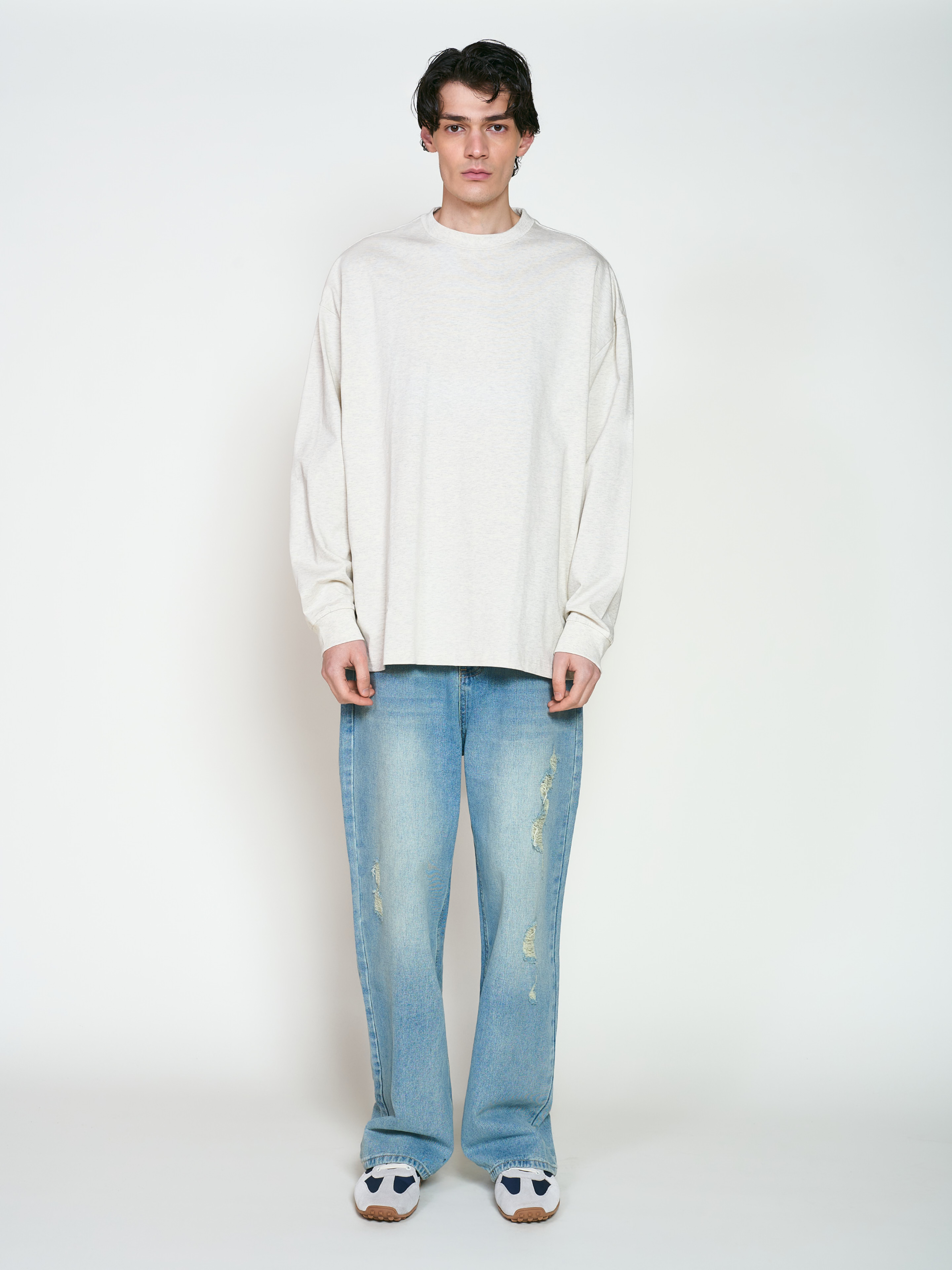 Джинсы свободного кроя, прямого силуэта. Модель выполнена из джинсы средней плотности, с эффектом времени. На передней части расположены порезы, а на нижней части брюк срезан задник. Два передних прорезных кармана и два задних.