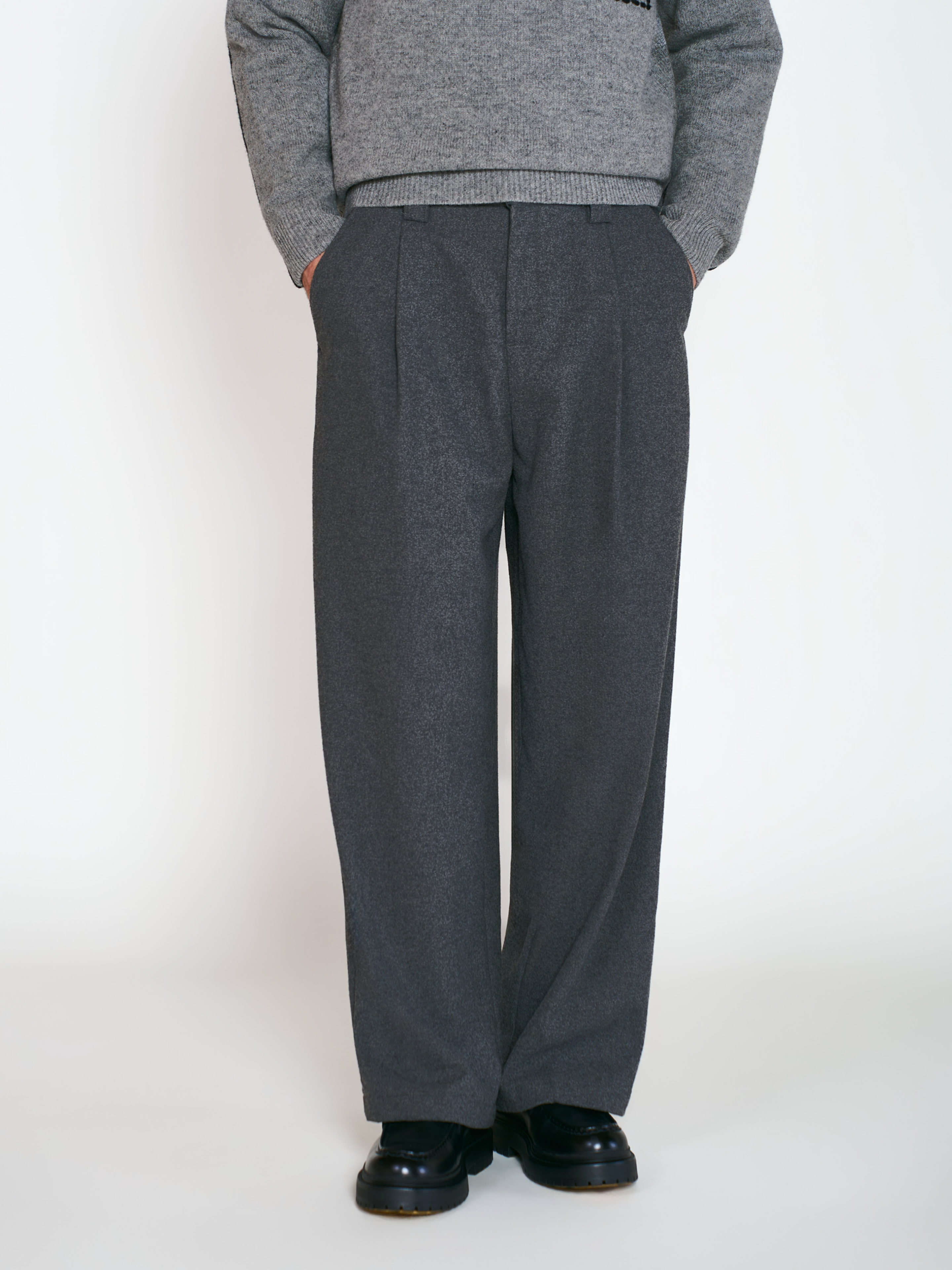 Брюки Reno прямого кроя, со стрелками. Модель выполнена из плотной смесовой ткани с добавлением шерсти. Пояс со шлевками для ремня, частично изготовлен на резинке для более комфортной посадки. Два боковых прорезных кармана и один задний. Параметры модели Рост: 188 см Грудь – 105 см, талия - 70 см, бедра - 93 см Размер на модели: L