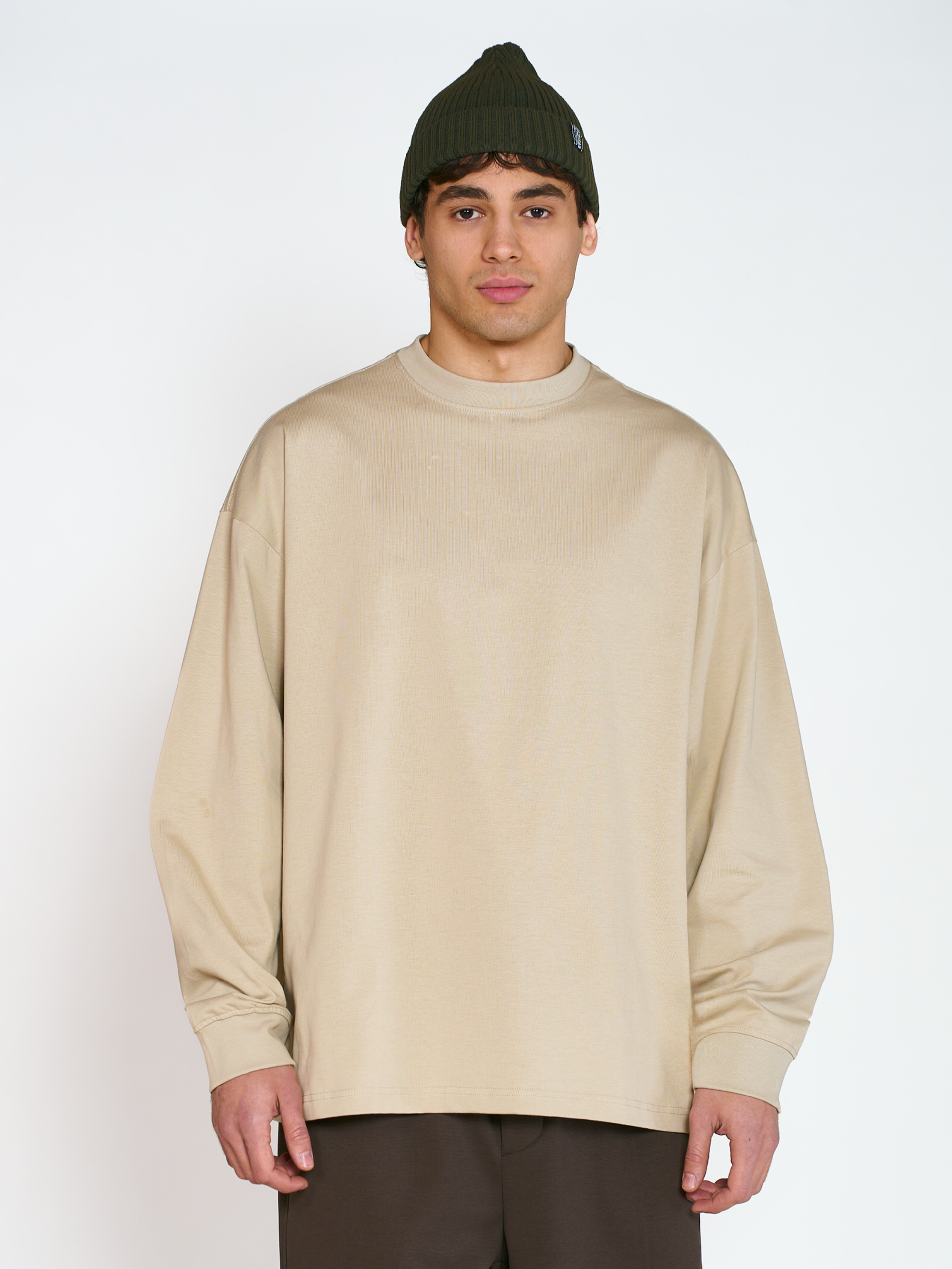 Лонгслив Cotora оверсайз кроя со спущенной линией плеча. Модель выполнена из плотной и гладкой хлопковой ткани, которая хорошо держит свою форму. Рукава с манжетами на резинке. Параметры модели Рост: 188 см Грудь – 105 см, талия - 70 см, бедра - 93 см Размер на модели: L