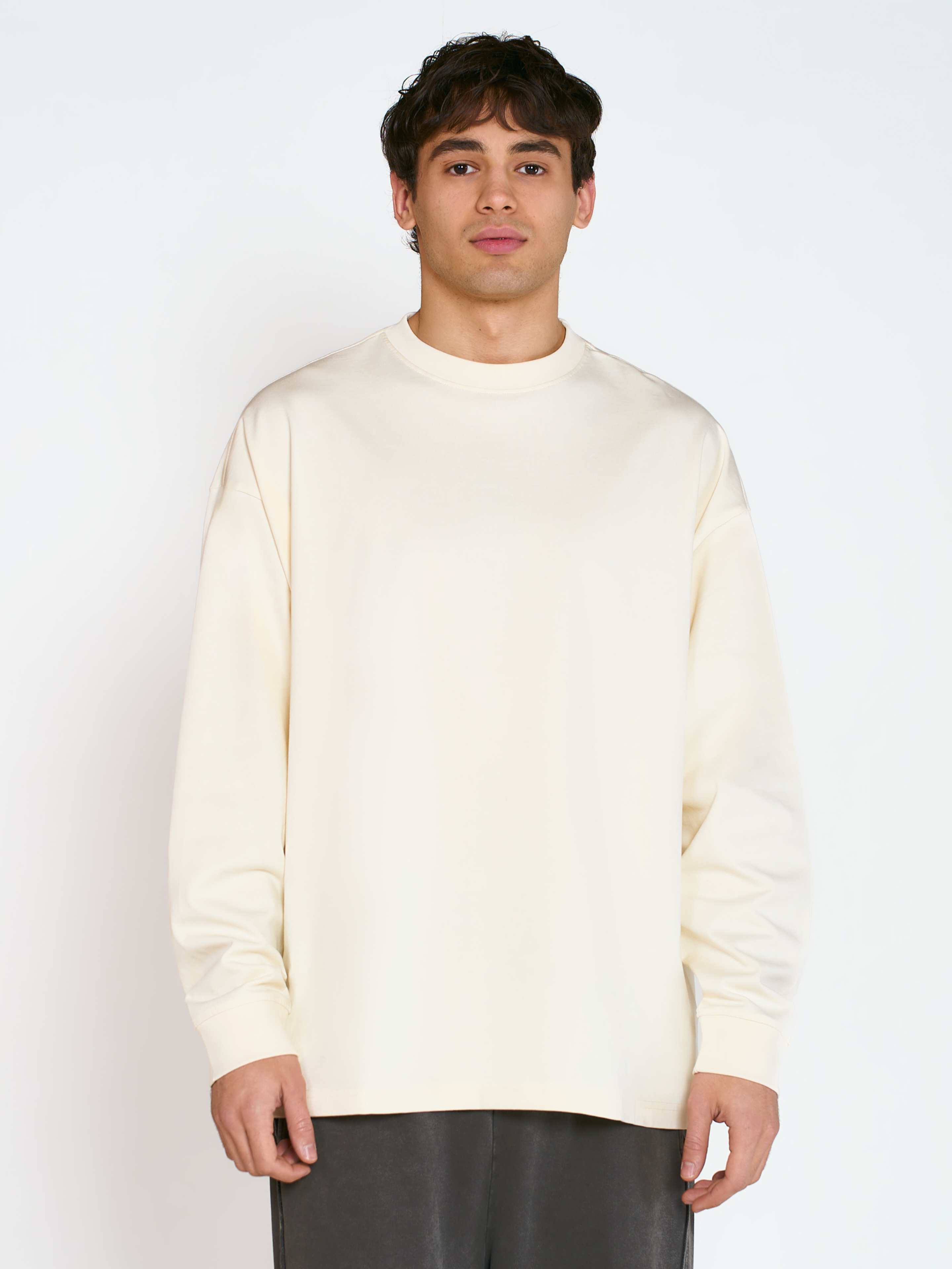Лонгслив Cotora оверсайз кроя со спущенной линией плеча. Модель выполнена из плотной и гладкой хлопковой ткани, которая хорошо держит свою форму. Рукава с манжетами на резинке. Параметры модели Рост: 188 см Грудь – 105 см, талия - 70 см, бедра - 93 см Размер на модели: L