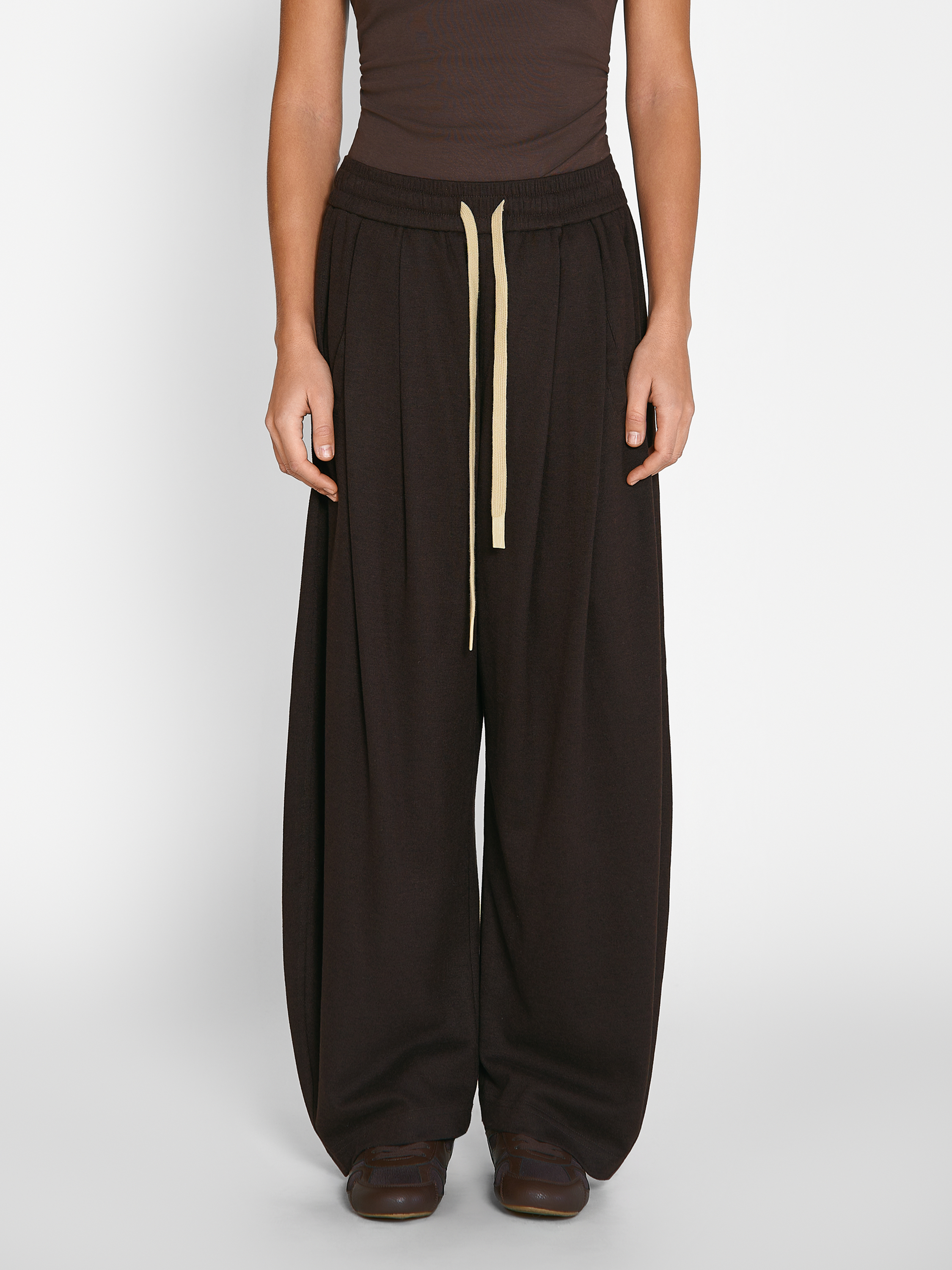 Брюки Brave свободного кроя, слегка заужены книзу. Модель выполнена из нежной и струящейся смесовой ткани с добавлением шерсти. Пояс изделия изготовлен на резинке с контрастными кулисками. Два боковых прорезных кармана. Параметры модели Рост: 170 см Грудь - 80 см, талия - 60 см, бедра - 89 см Размер на модели: XS