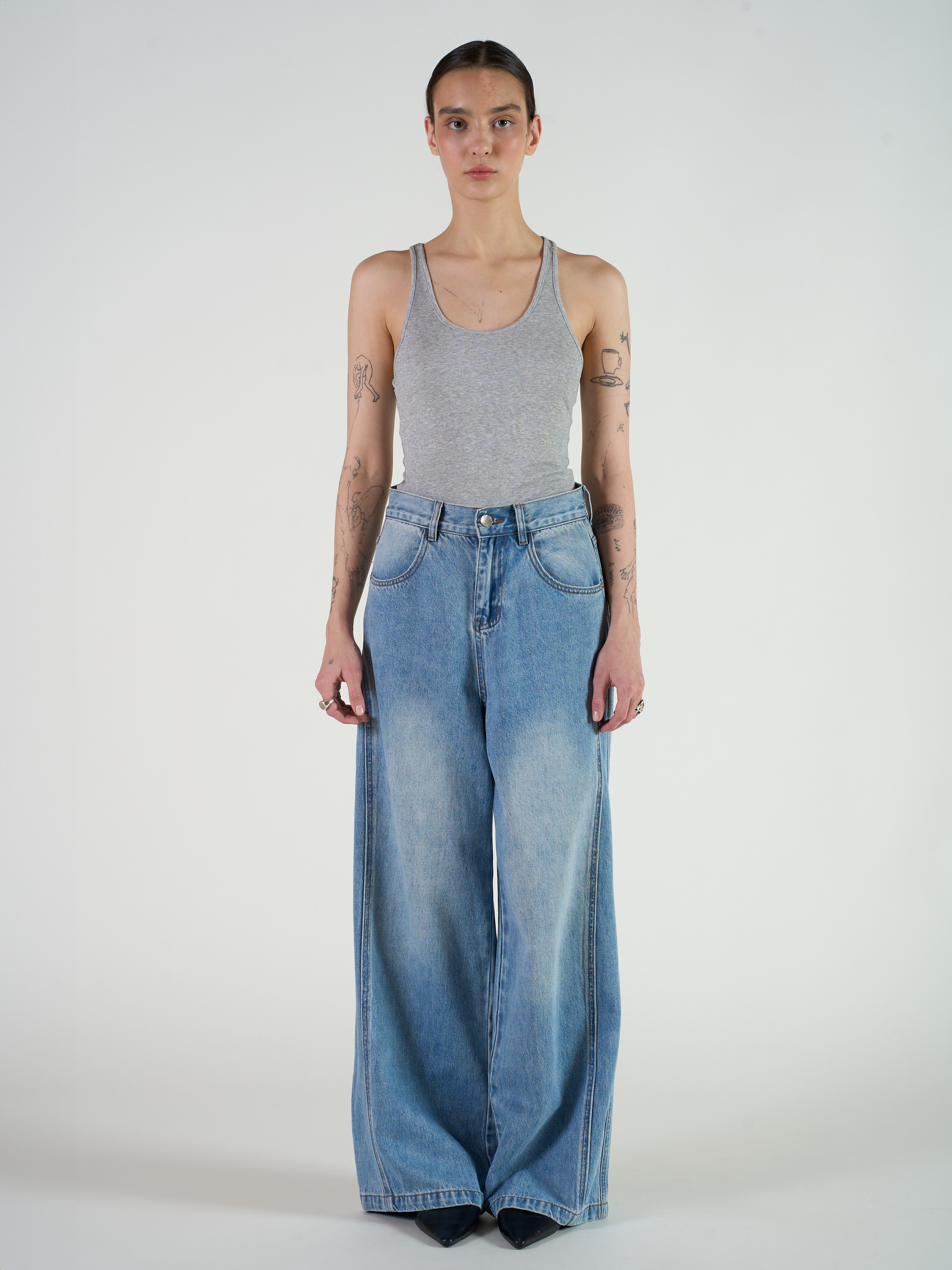 Джинсы широкого кроя, прямого силуэта с высокой посадкой. Изделие выполнено из мягкой вареной джинсы со стрейч-эффектом. Пояс со шлевками для ремня, два передних прорезных кармана и два задних накладных. Параметры модели Рост: 173 см Грудь - 80 см, талия - 62 см, бедра - 90 см Размер на модели: S