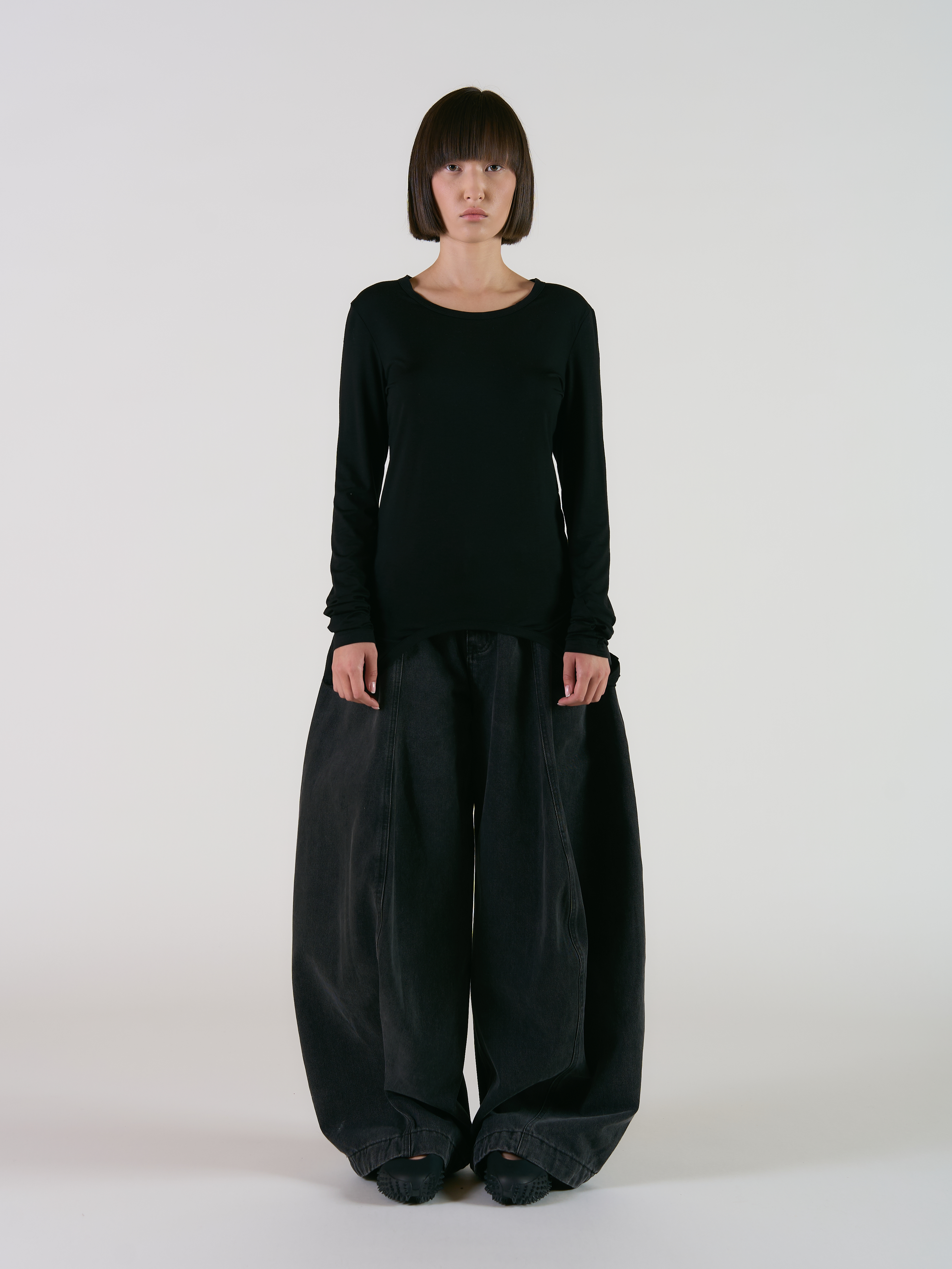 Джинсы широкого кроя, О-силуэта. Данный объем получился за счет сшитых трех частей, а не двух. Для этой пары мы выбрали вареный деним с однородным окрасом, средней плотности. Три передних прорезных кармана и два задних накладных. Средняя посадка, пояс со шлевками для ремня. Застегивается на пуговицу и молнию. Джинсы Seamplay хорошо сочетаются с облегающими вещами и с теми, что создают другую форму, например перевернутый треугольник или шар, которые подчеркнут линию талии. Параметры модели Рост: 164 см Грудь - 85 см, талия - 63 см, бедра - 93 см Размер на модели: S