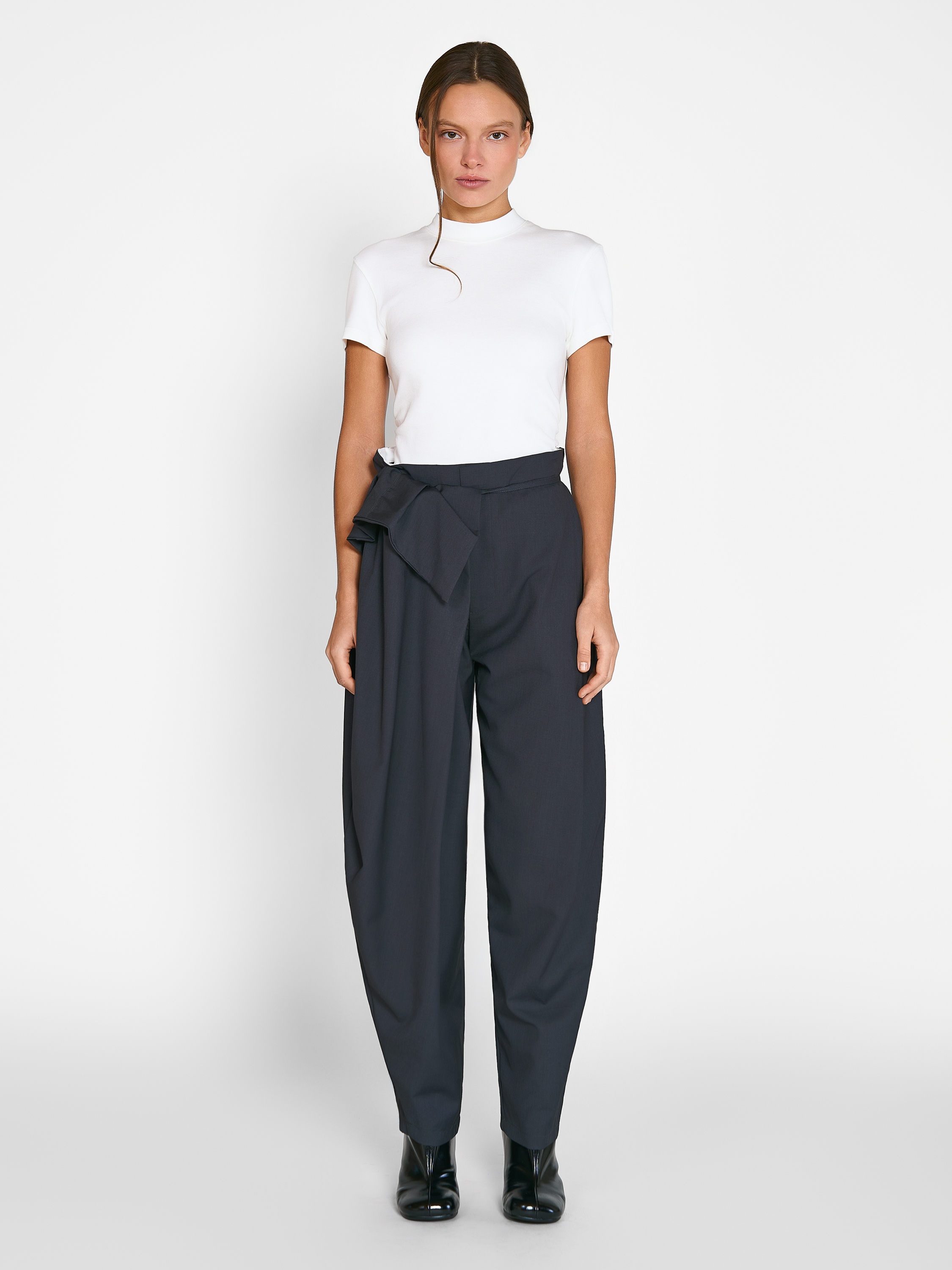 Брюки свободного кроя, с дополнительной драпировкой на запах на тонком ремешке. Модель выполнена из струящейся костюмной ткани. Два боковых прорезных кармана и один задний. Застегивается на молнию и скрытые металлические застежки. Параметры модели Рост: 170 см Грудь - 80 см, талия - 60 см, бедра - 89 см Размер на модели: S
