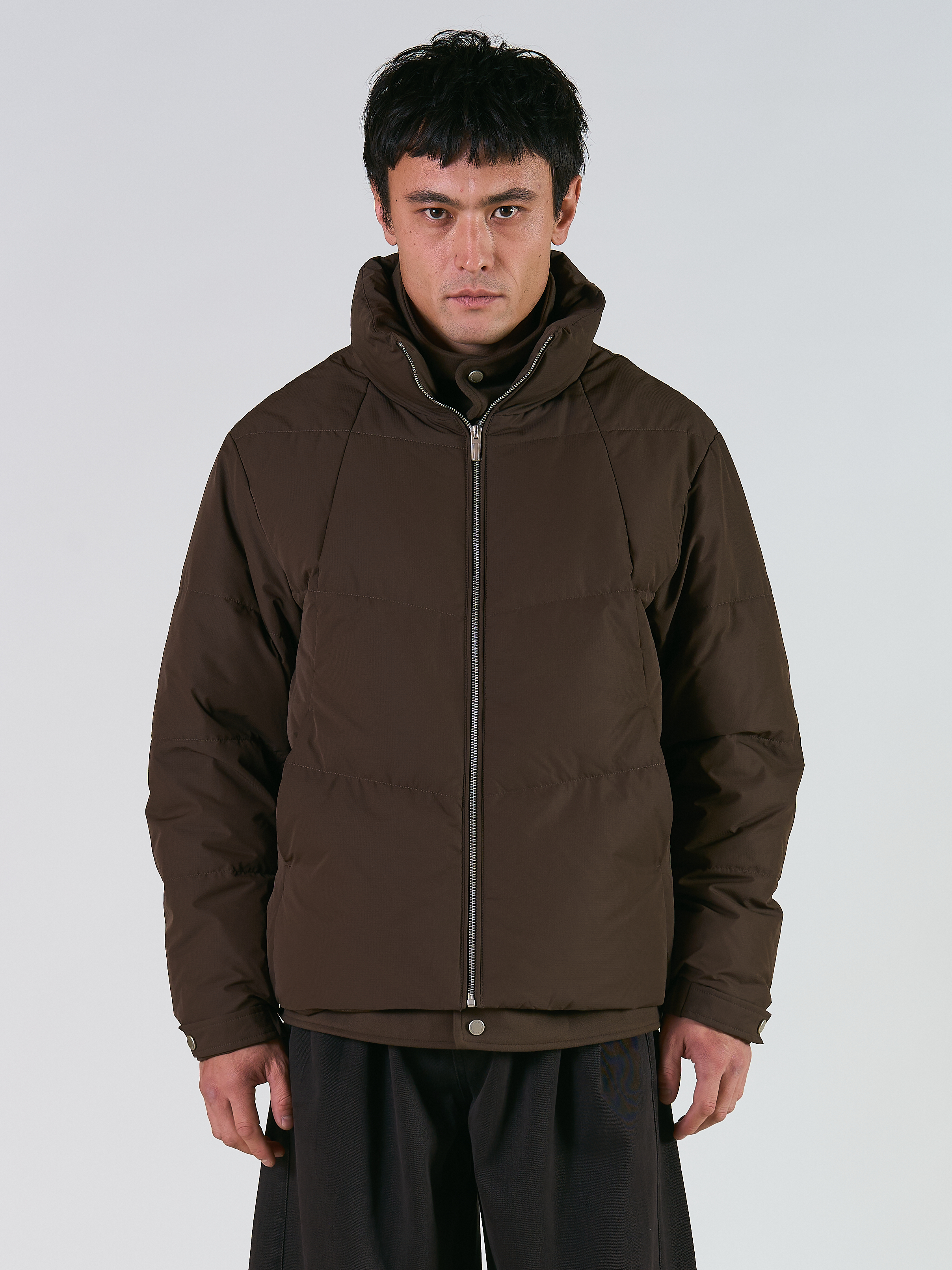 Куртка double, воротник-стойка. Внутренний слой выполнен из плотного текстиля и застегивается на металлические кнопки, основная часть курточная ткань с застежкой на молнии. Два передних прорезных кармана и один внутренний. Белый утиный пух в качестве утеплителя. Можно носить до -15 градусов с теплым свитером.