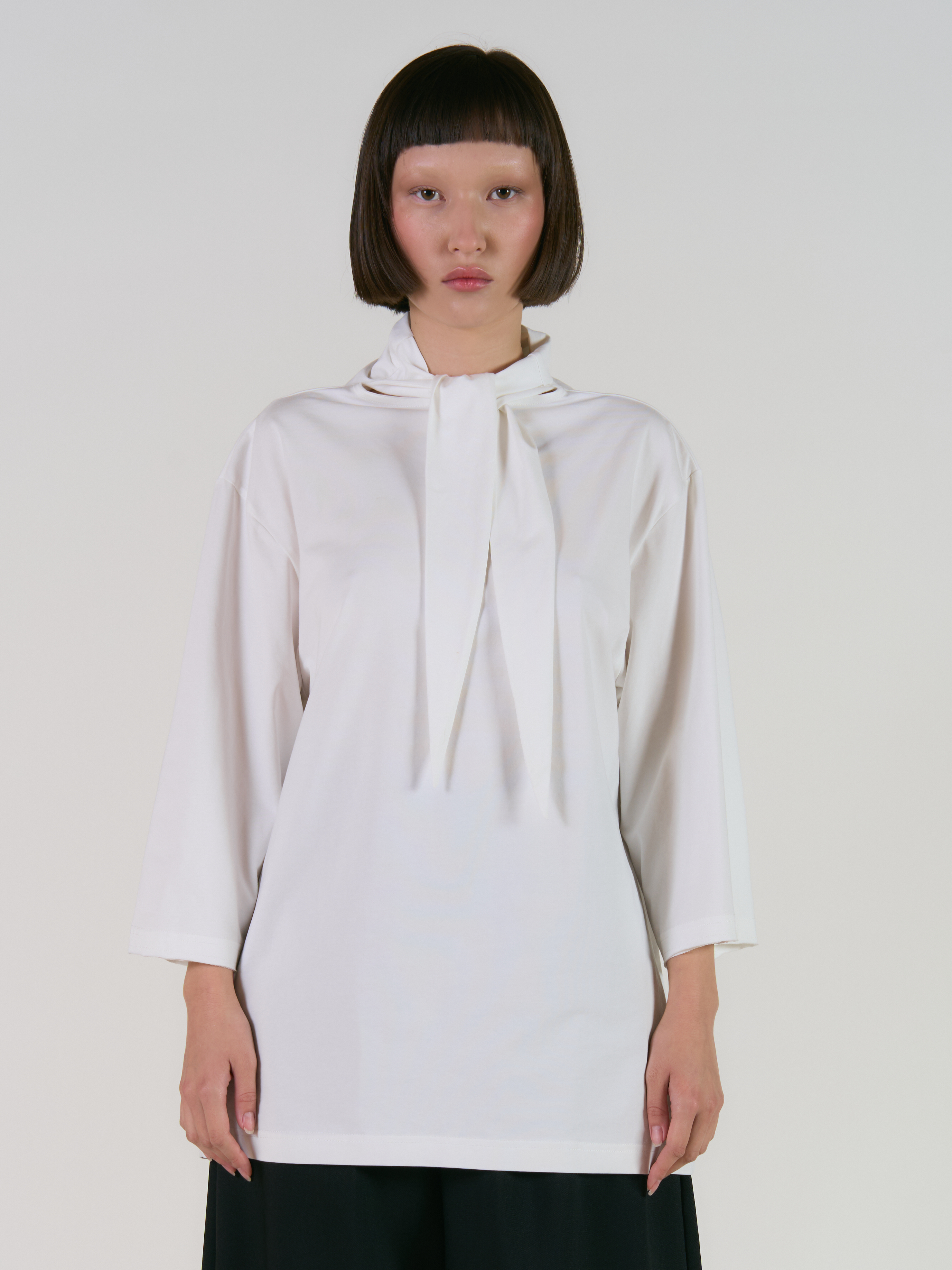 Футболка Bow-tie оверсайз кроя, рукав 3/4. Для этой модели мы выбрали не классический ворот, а воротник с заостренными лентами, которые можно завязать как бант или галстук. Изделие выполнено из мягкой трикотажной ткани.