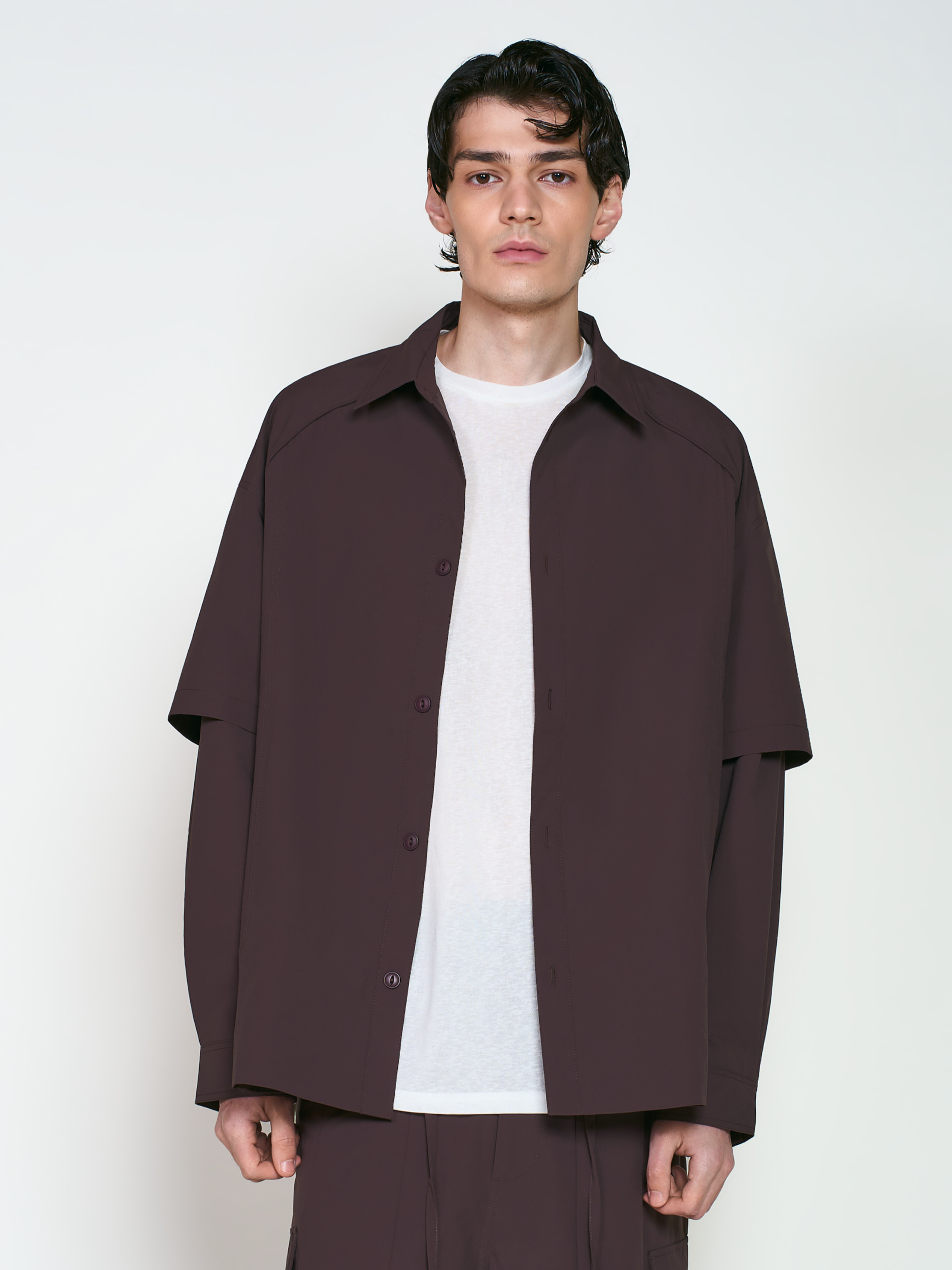 Куртка-рубашка свободного кроя в многослойной технике. Модель выполнена из мягкой плащевой ткани с гладкой фактурой. Застегивается на пуговицы.