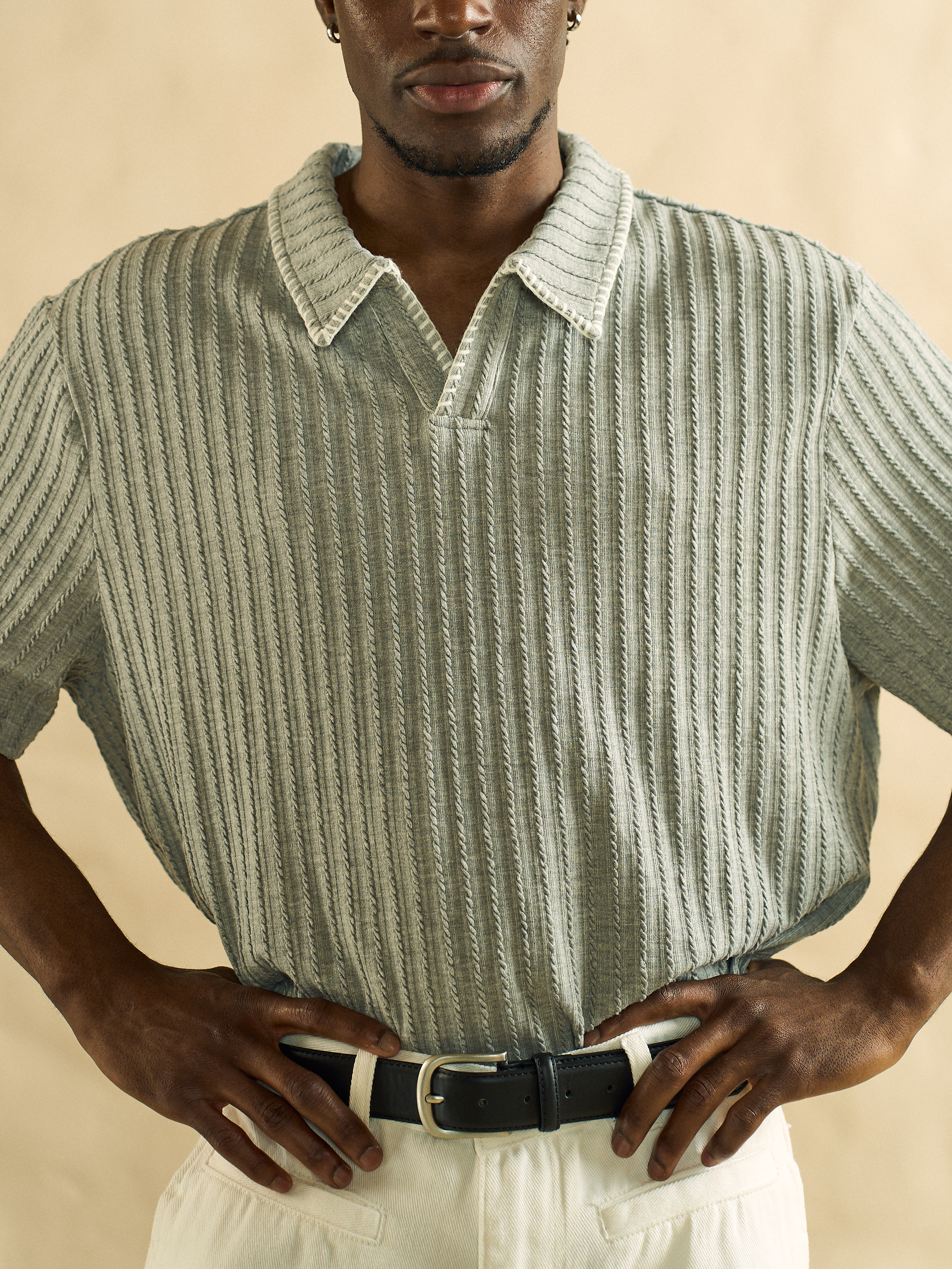 Поло Braids свободного кроя, с отложным воротником, с контрастной обработкой края. Неглубокий V-образный вырез. Модель выполнена из мягкой трикотажной ткани с плетеным узором, напоминающим косички.