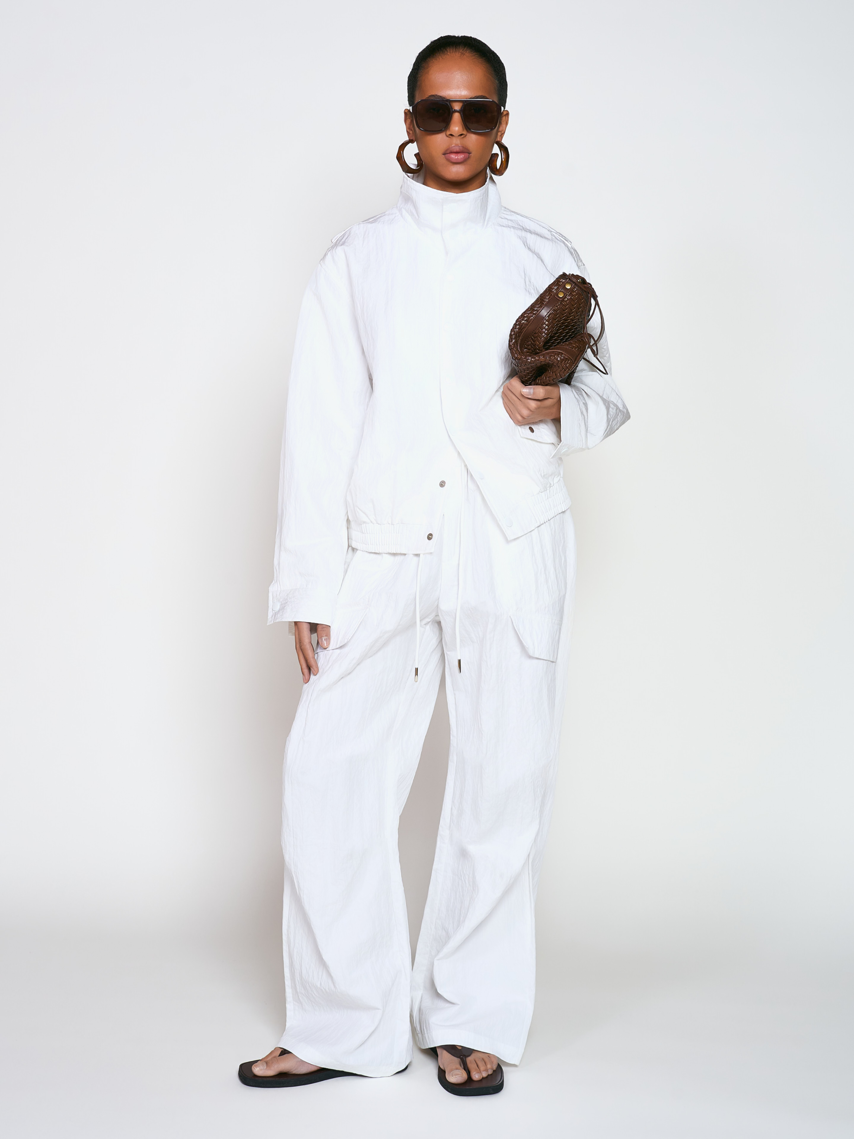Брюки свободного кроя, с драпировкой по бокам и имитацией накладных карманов. Модель изготовлена из сжатой ткани с прорезиненным эффектом. Напоминает мятую бумагу. Пояс изделия выполнен на резинке с кулисками. Два боковых прорезных кармана и два задних. Для полноценного костюма отдельно можно приобрести ветровку из жатой ткани. Параметры модели: Парень Рост: 180 см Грудь - 90 см, талия - 75 см, бедра - 87 см Размер на модели: М Девушка Рост: 170 см Грудь - 83 см, талия - 56 см, бедра - 84 см Размер на модели: XS
