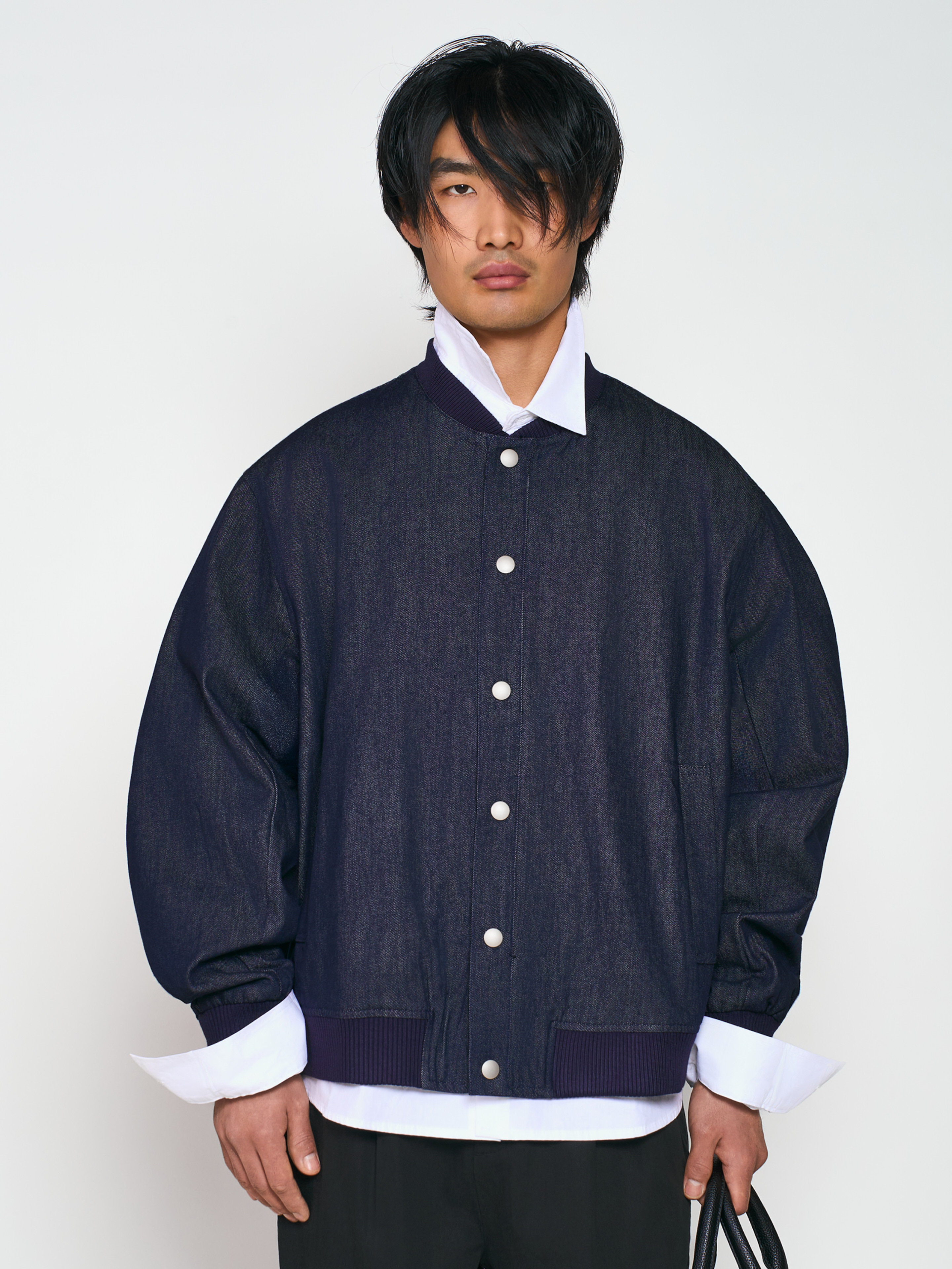 Джинсовый бомбер-олимпийка свободного кроя из плотного хлопкового денима. Застежка на кнопки. Длинные рукава с манжетами на резинке, спущенная линия плеча. Два боковых прорезных кармана. Трендовая джинсовая олимпийка идеально подойдет как для повседневных, так и для вечерних образов.