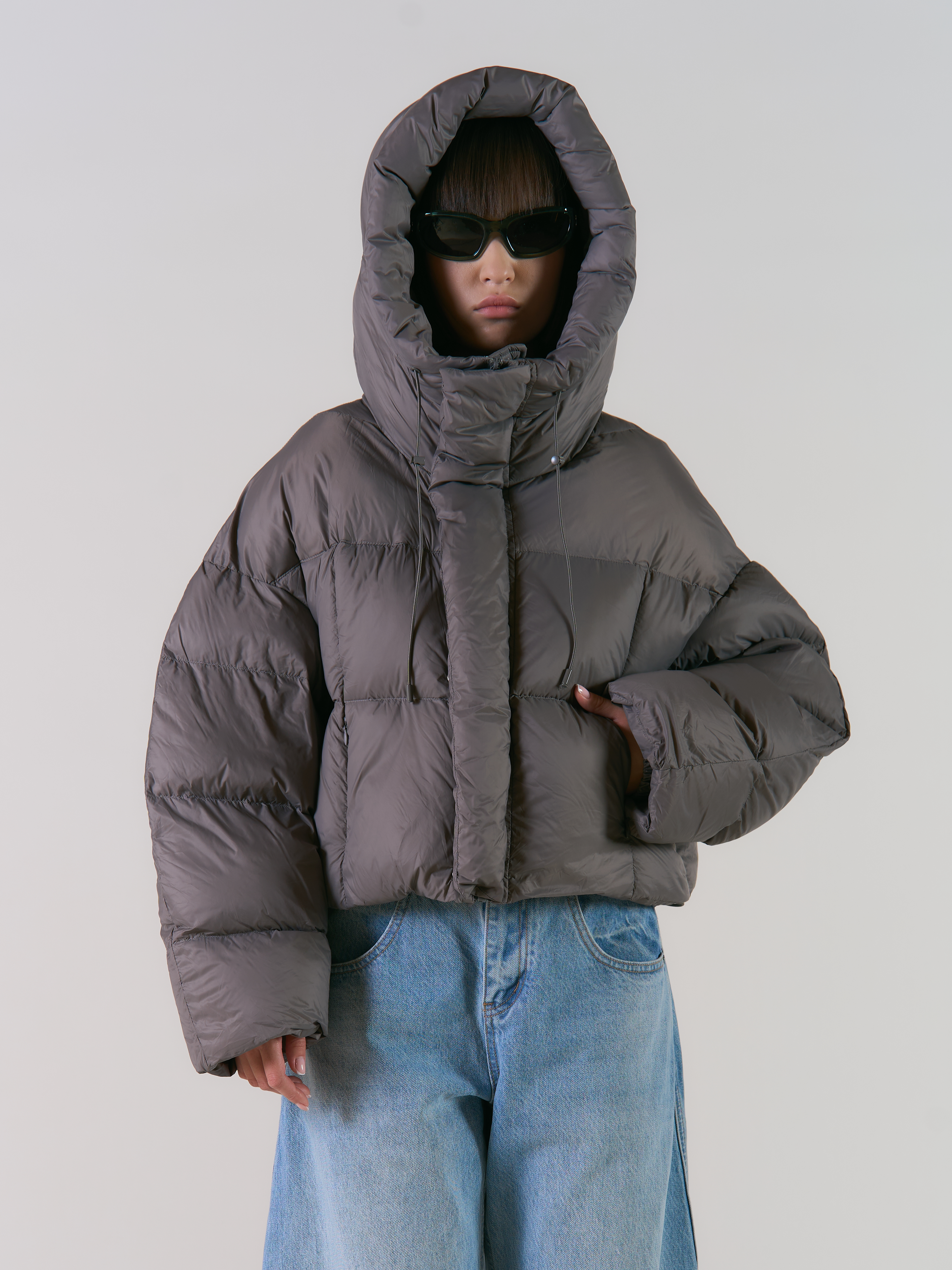 Короткая женская куртка. Высокий воротник-стойка и объемный капюшон на завязках для защиты от ветра и мороза. Длинные свободные рукава и спущенная линия плеча. Застежка на молнию по всей длине. Прямой нижний край без разрезов и утяжки со стопперами по бокам