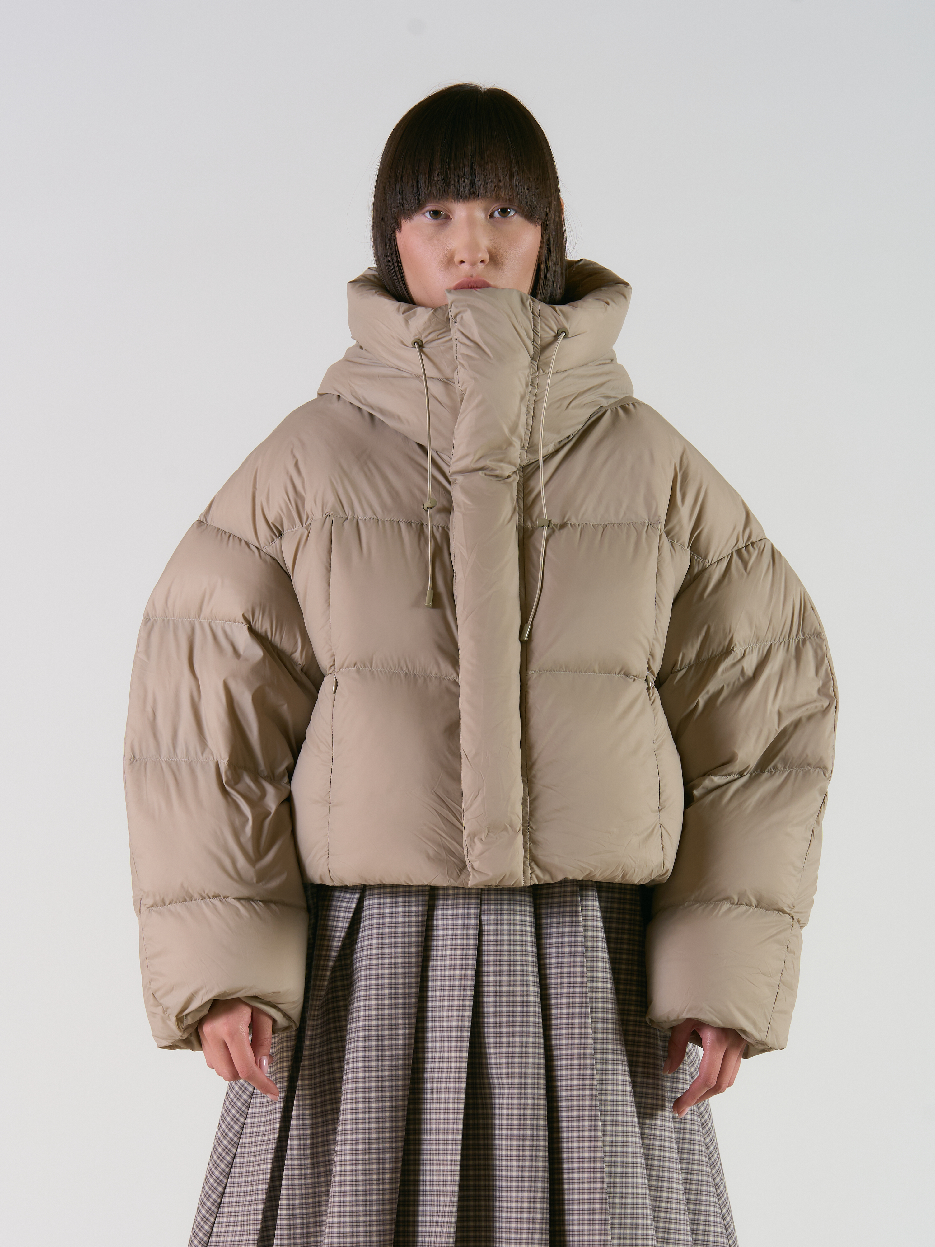 Короткая женская куртка. Высокий воротник-стойка и объемный капюшон на завязках для защиты от ветра и мороза. Длинные свободные рукава и спущенная линия плеча. Застежка на молнию по всей длине. Прямой нижний край без разрезов и утяжки со стопперами по бокам