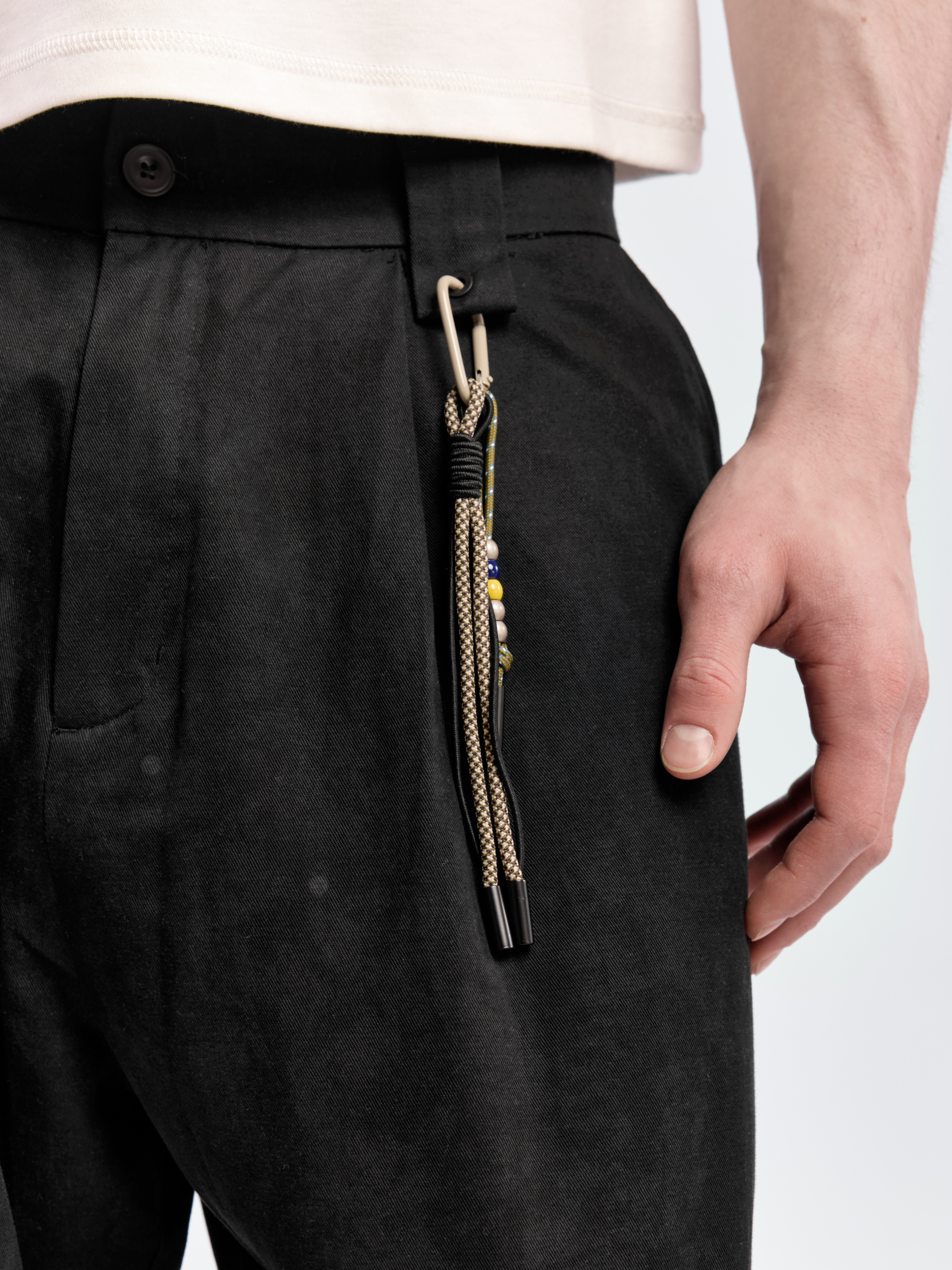 Брюки свободного кроя, слегка заужены к низу. Классическая модель, выполненная из смесовой ткани с не ярко выраженным пятнистым принтом, благодаря особой технике окрашивания материала. Пояс частично выполнен на резинке с шлевками для ремня. Застегивается на пуговицу и молнию. Также в комплекте идет карабин с брелоком, при надобности аксессуар можно отстегнуть. Два боковых прорезных кармана и два задних. . Параметры модели Рост: 180 см Грудь - 90 см, талия - 75 см, бедра - 87 см Размер на модели: L