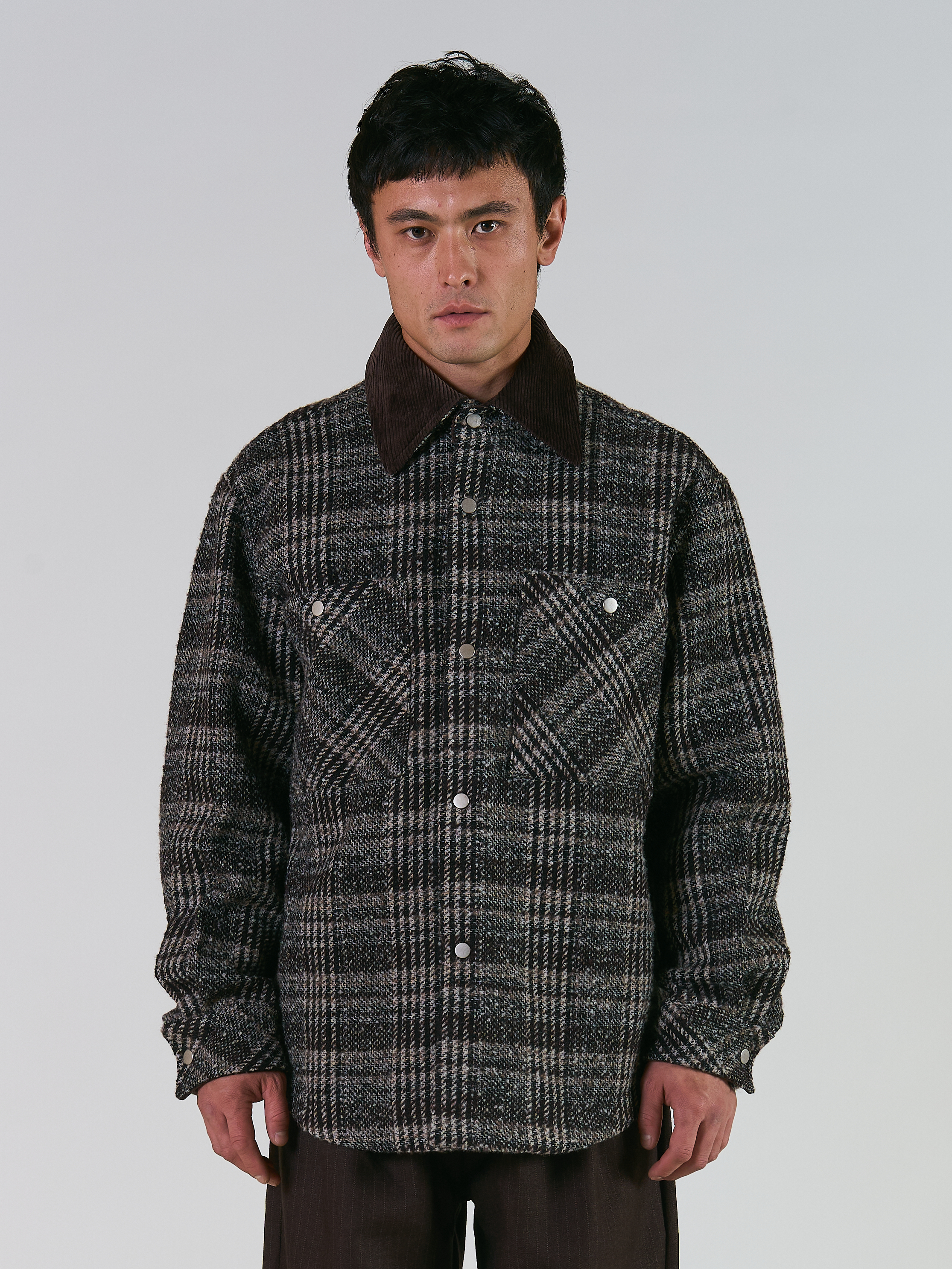 Короткая куртка - рубашка свободного кроя из плотной, теплой ткани и ворсистой фактурой. Классический воротник с застежкой под горло. Застежки в виде кнопок по всей длине, манжетах и карманах.