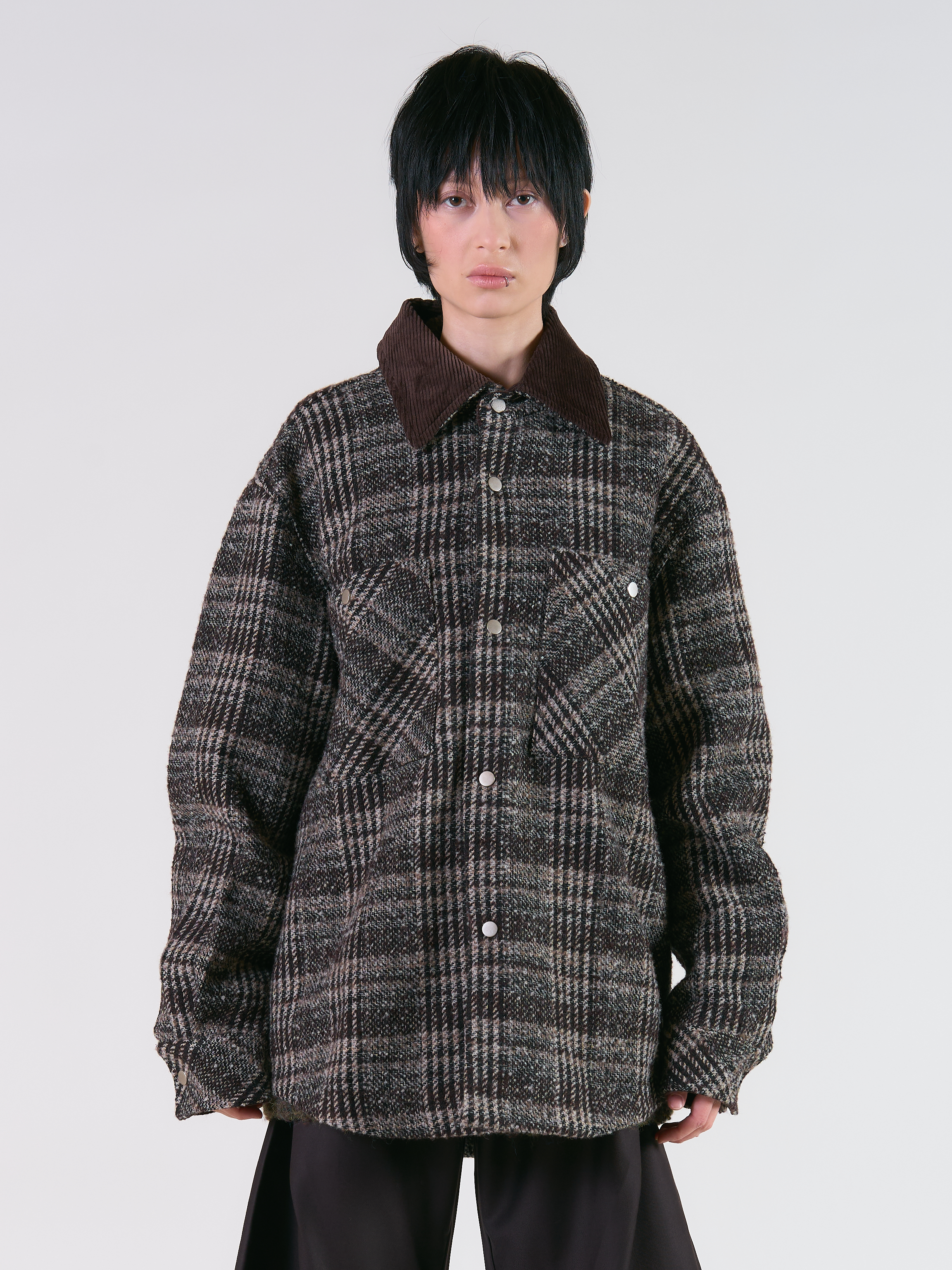 Короткая куртка - рубашка свободного кроя из плотной, теплой ткани и ворсистой фактурой. Классический воротник с застежкой под горло. Застежки в виде кнопок по всей длине, манжетах и карманах.