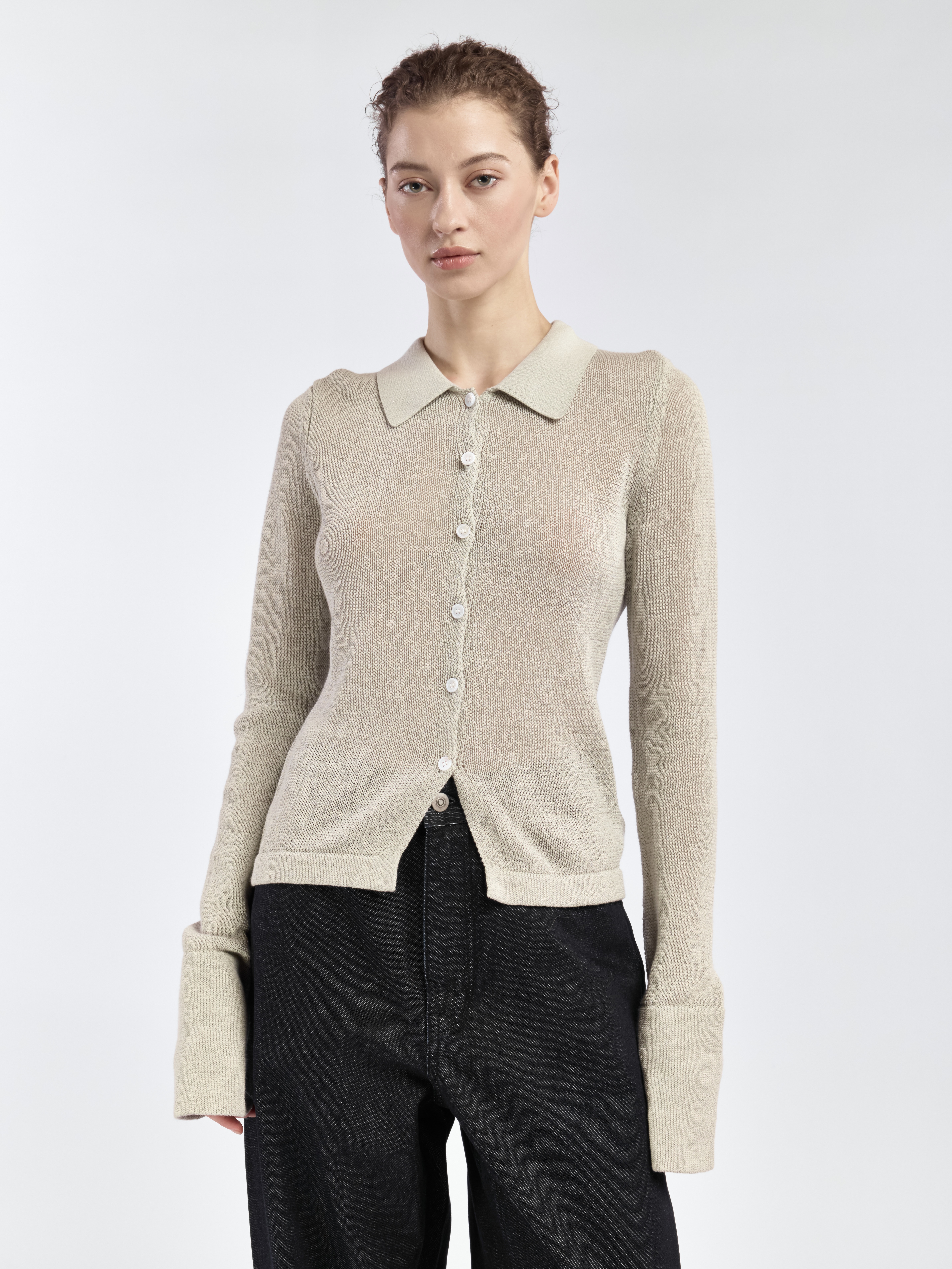 Поло с длинным рукавом, облегающего кроя. Изделие связано из смесовой пряжи, с полупрозрачным эффектом. Застегивается на контрастные пуговицы по всей длине. Параметры модели Рост: 171 см Грудь - 80 см, талия - 59 см, бедра - 87 см Размер на модели: XS
