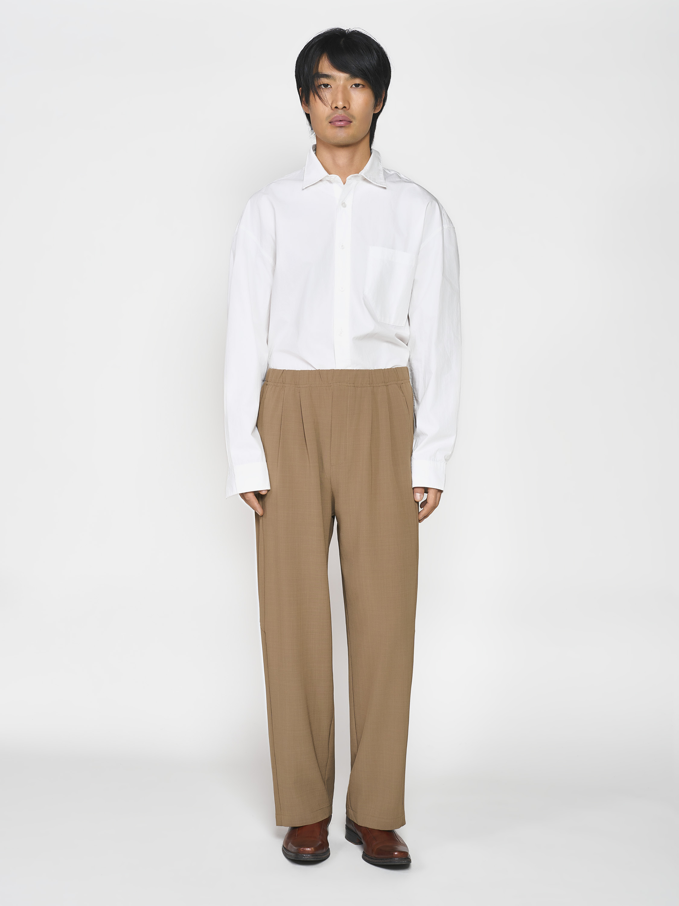 Брюки с защипами свободного кроя, слегка зауженные к низу. Для модели использовали тонкую и струящуюся ткань. Пояс изделия выполнен на резинке, с внутренними кулисками для регулирования степени прилегаемости к телу. Два боковых прорезных кармана и один задний. Также отдельно можно приобрести рубашку Sand для создания полноценного комплекта.