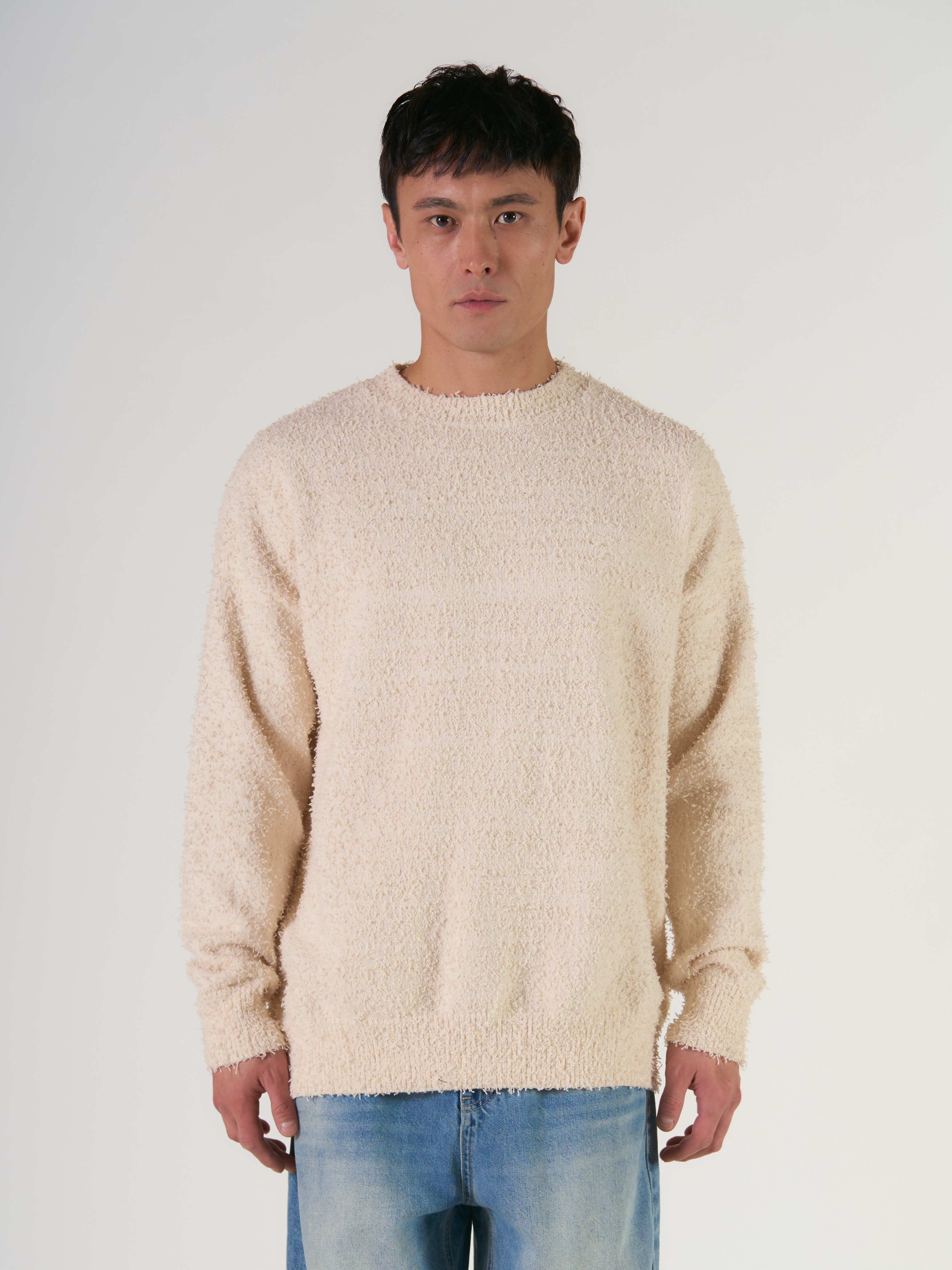 Свитер вязаный свободного кроя с круглым горлом, вязка выполнена двумя видами ниток, что создает эффект букле с вытянутыми петлями. Параметры модели: Рост: 190 см Грудь - 105 см, талия - 88 см, бедра - 98 см Размер на модели: L