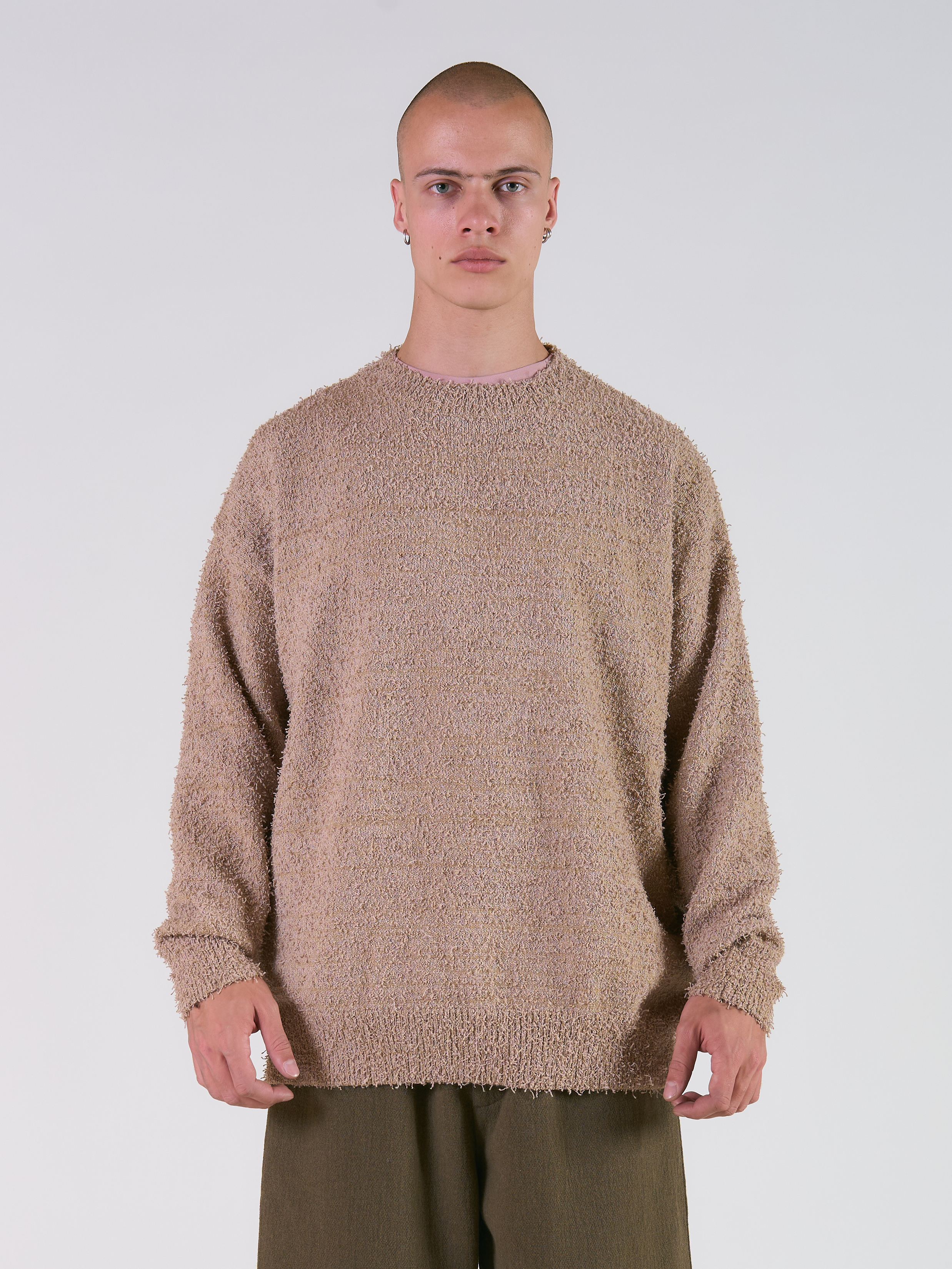 Свитер вязаный свободного кроя с круглым горлом, вязка выполнена двумя видами ниток, что создает эффект букле с вытянутыми петлями. Параметры модели: Рост: 190 см Грудь - 105 см, талия - 88 см, бедра - 98 см Размер на модели: L