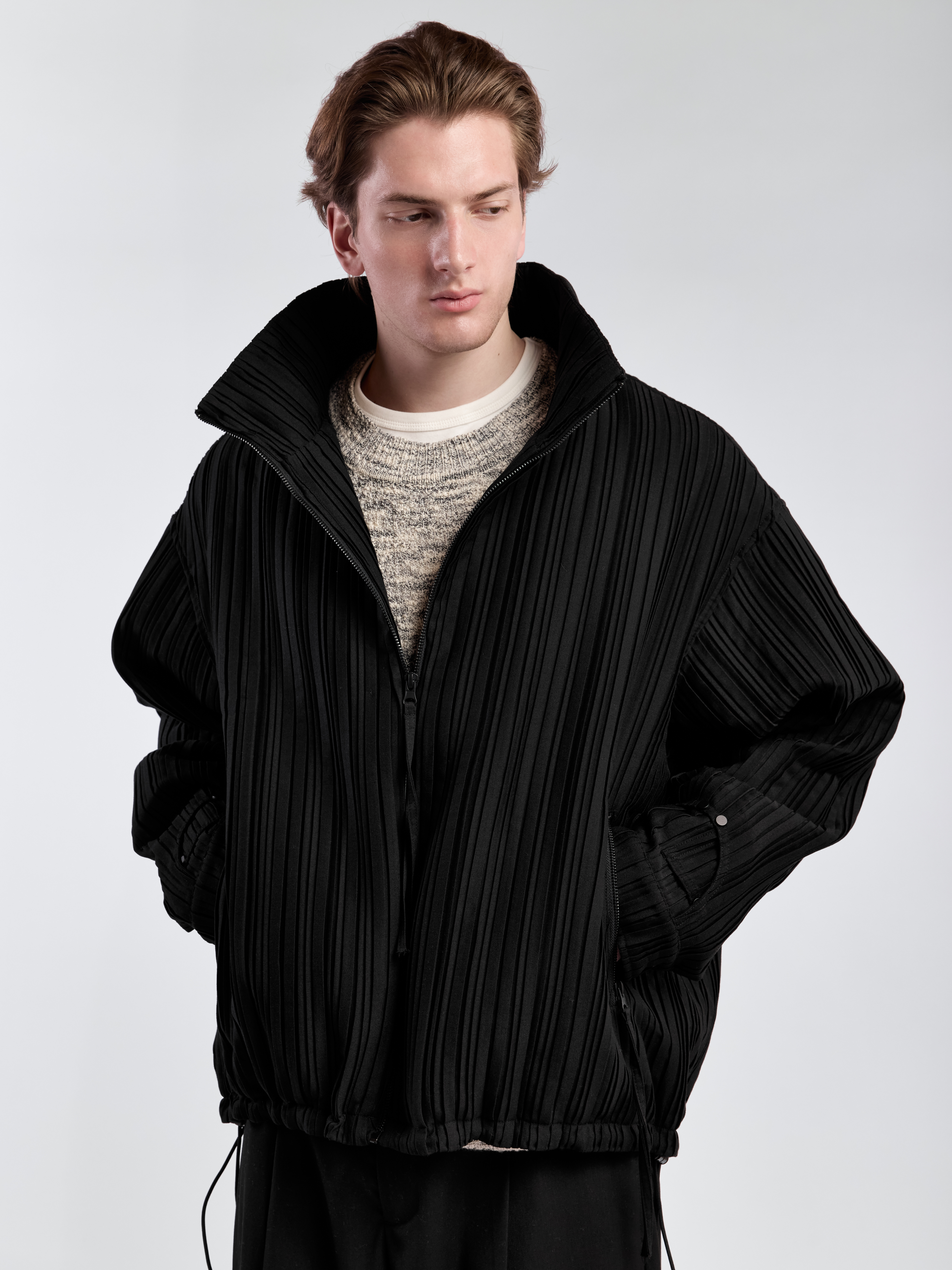 Куртка на молнии в духе авангарда. Широкий ворот стойка. Выполнена из плиссированной ткани с хлопковым подкладом. Имеет два передних боковых кармана на молнии и два внутренних. Манжеты рукавов застегиваются на пуговицы, низ изделия можно утягивать с помощью кулисок. Параметры модели Рост: 186 см Грудь – 100 см, талия - 73 см, бедра - 94 см Размер на модели: М