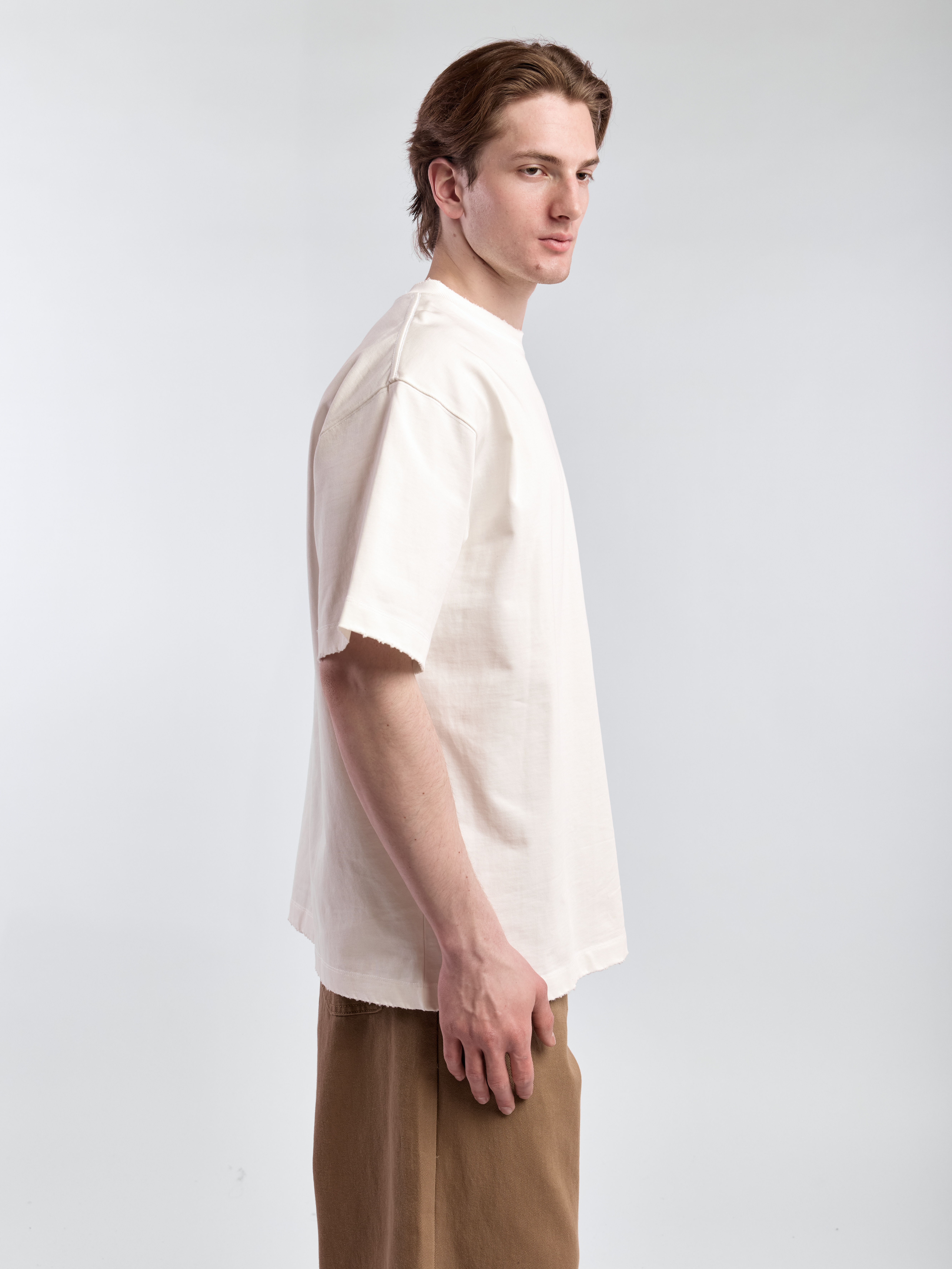 Футболка широкого кроя с необработанным краем. Модель выполнена из плотного хлопка. Параметры модели Рост: 189 см Грудь – 103 см, талия - 79 см, бедра - 97 см Размер на модели: L