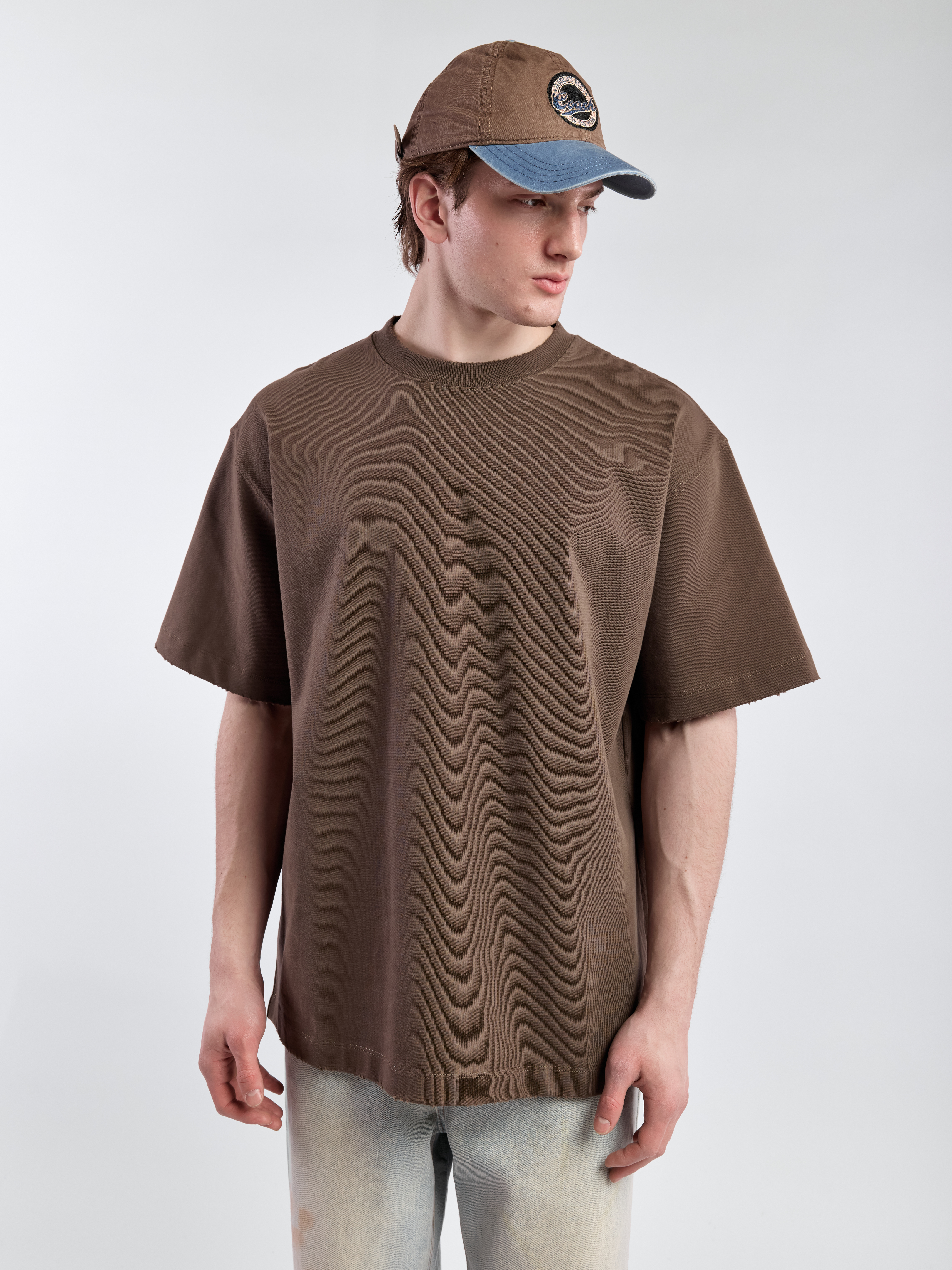 Футболка широкого кроя с необработанным краем. Модель выполнена из плотного хлопка. Параметры модели Рост: 189 см Грудь – 103 см, талия - 79 см, бедра - 97 см Размер на модели: L