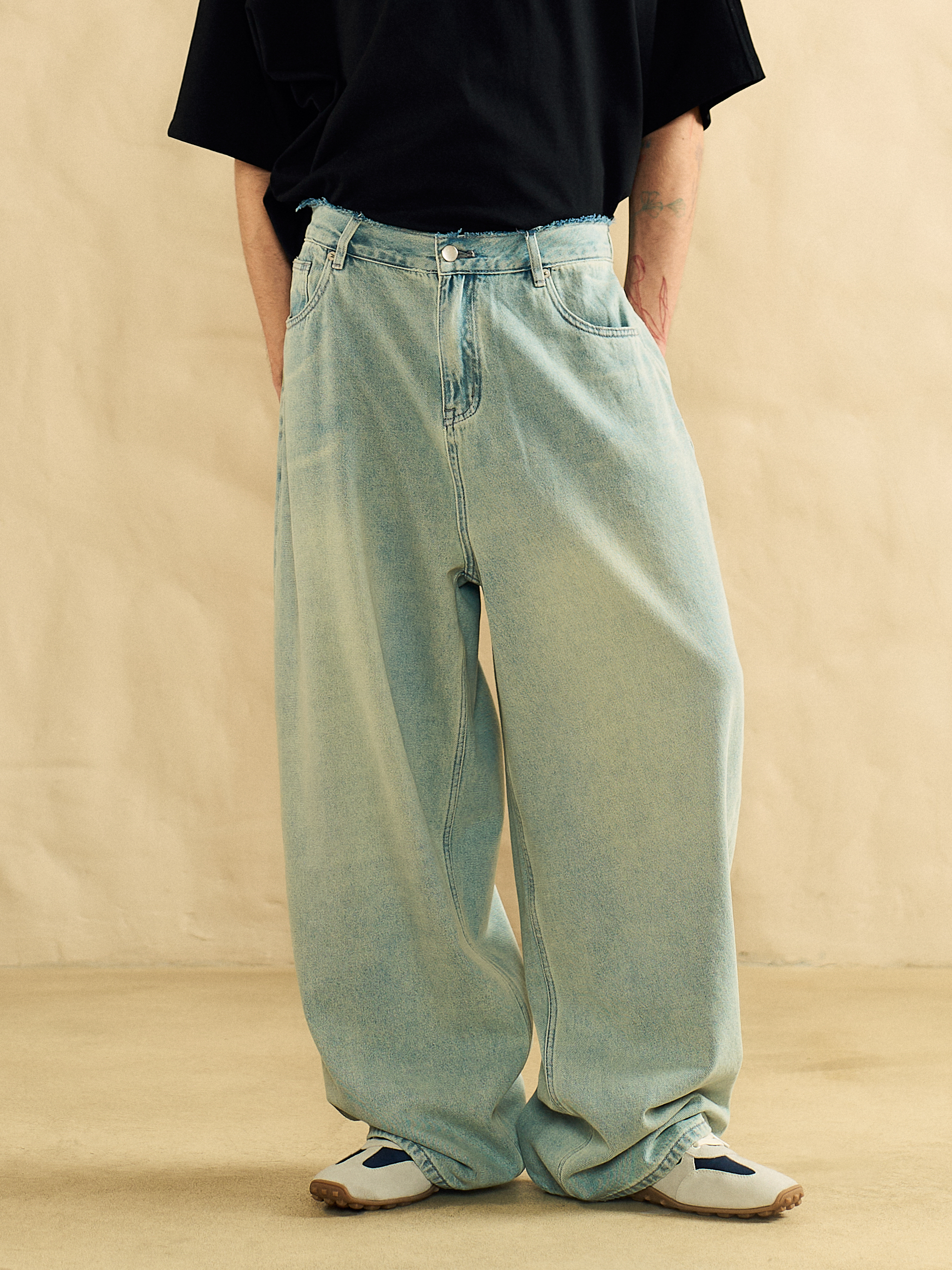 Джинсы Belt оверсайз кроя, Baggy fit. Модель выполнена из вареного денима средней плотности, с эффектом времени. Пояс изделия обрезан и не обработан, поэтому край получился пушистым. Также присутствуют шлевки для ремня. Два передних прорезных кармана и два задних накладных.