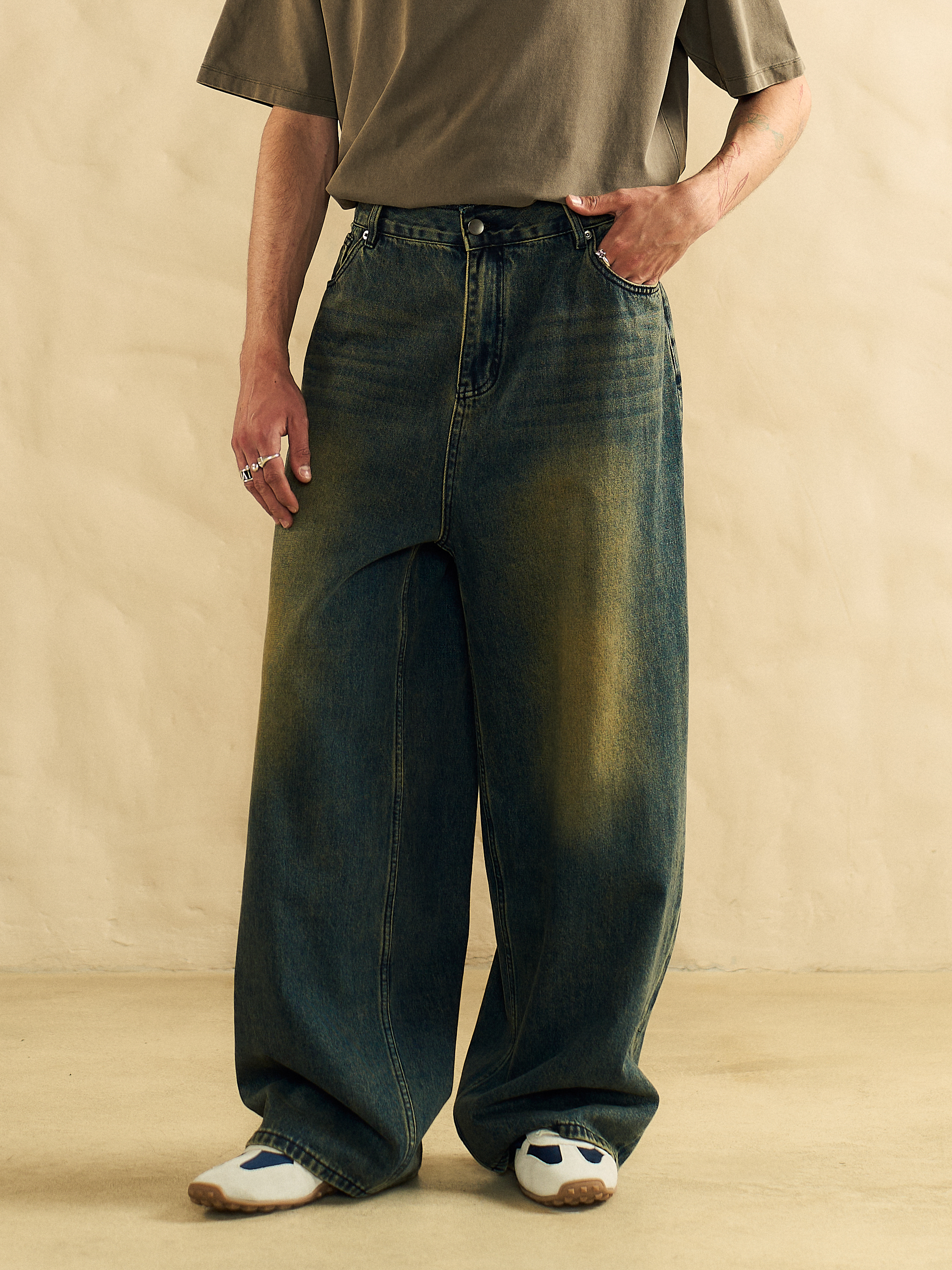 Джинсы Belt оверсайз кроя, Baggy fit. Модель выполнена из вареного денима средней плотности, с эффектом времени. Пояс изделия обрезан и не обработан, поэтому край получился пушистым. Также присутствуют шлевки для ремня. Два передних прорезных кармана и два задних накладных.