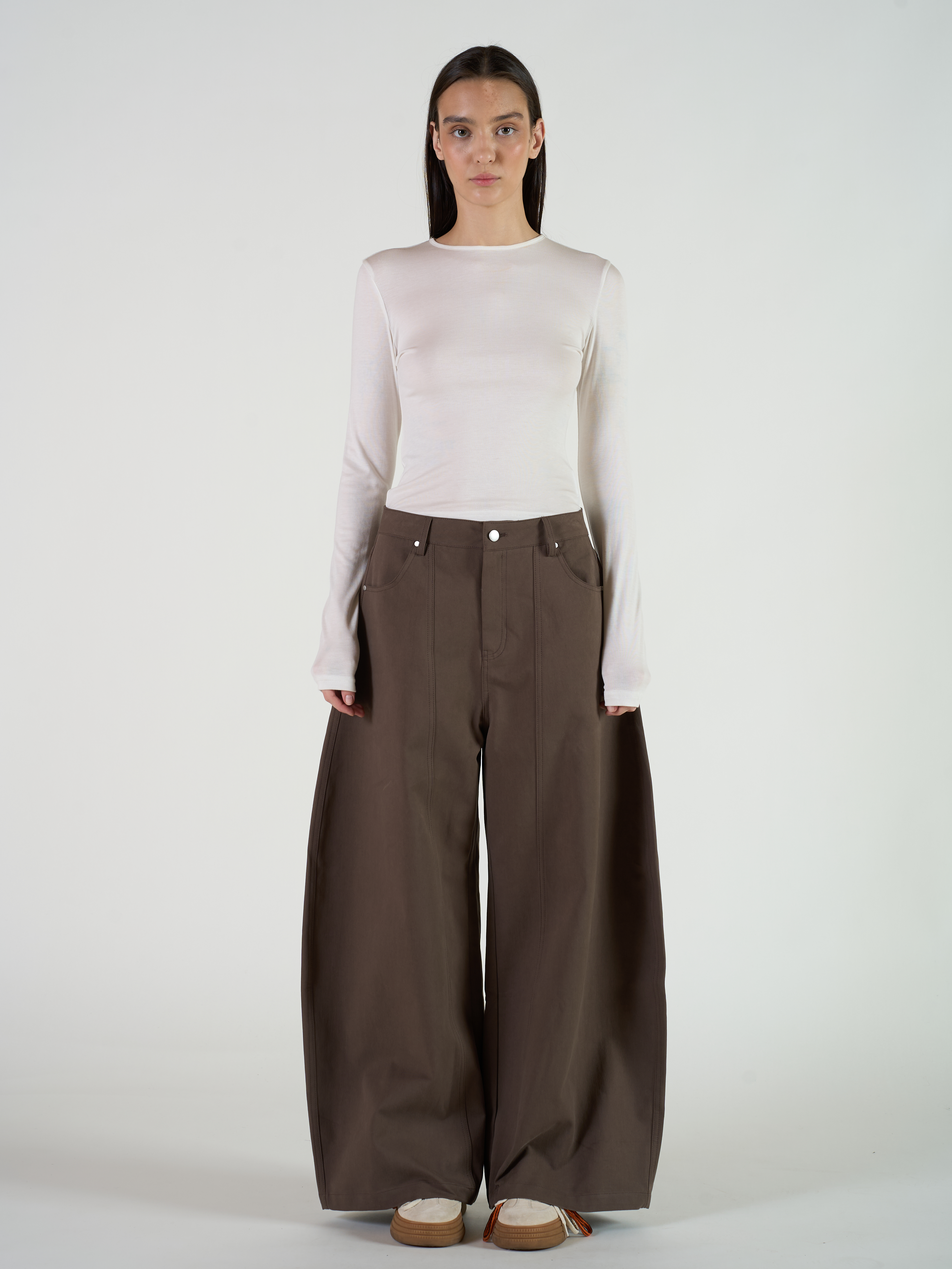 Брюки экстра широкого кроя, о‑силуэта. Модель выполнена из плотной хлопковой ткани с небольшим велюровым эффектом. Пояс со шлёвками для ремня, застегивается на молнию и пуговицу. Два передних прорезных кармана и два задних накладных кармана. Параметры модели Рост: 173 см Грудь - 80 см, талия - 62 см, бедра - 90 см Размер на модели: S