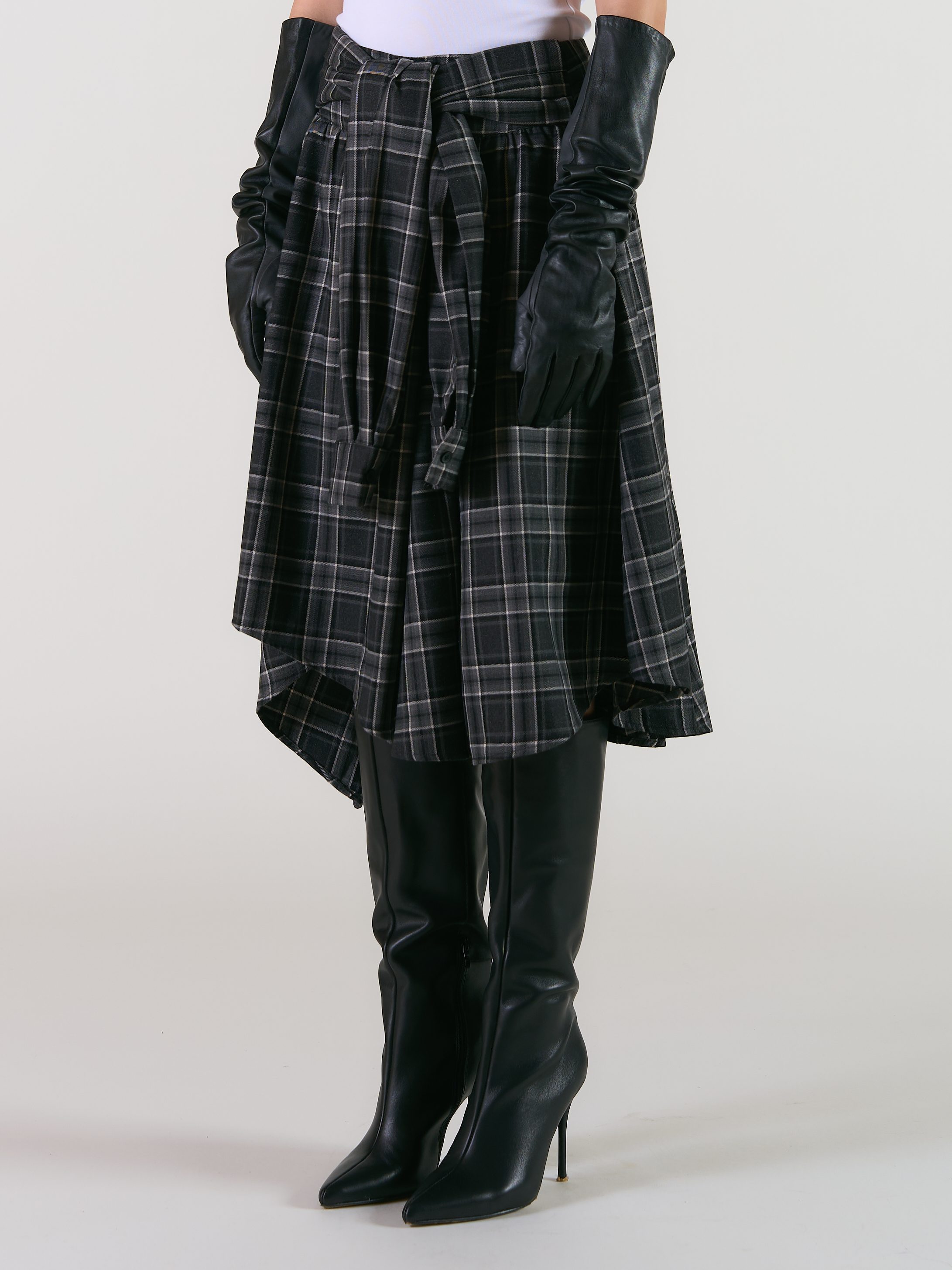 Юбка Reconstructed ассиметричного кроя, длина чуть ниже колена. Модель выполнена в стиле upcycle, словно любимую рубашку решили перешить в юбку и рукава интегрировали в пояс, чтобы подвязывать его и создать многослойность и сложность кроя. Застегивается на боковую молнию. Параметры модели Рост: 164 см Грудь - 85 см, талия - 63 см, бедра - 93 см Размер на модели: S