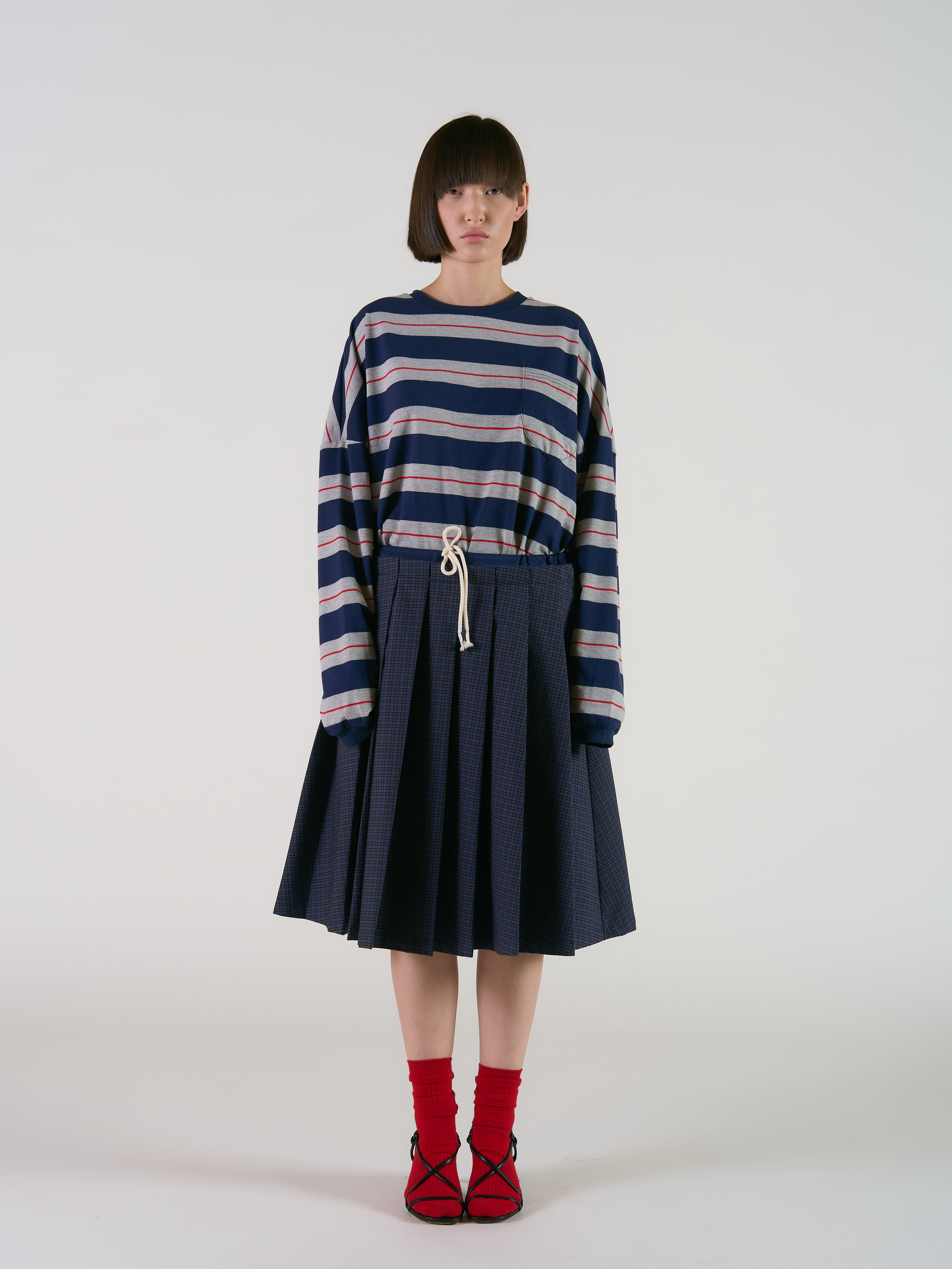 Юбка со складками, напоминающими школьную эстетику, длина чуть ниже колена. Юбка имеет двойной пояс с кулисками, благодаря которым можно регулировать обхват и создавать дополнительный объем. Также присутствует боковая скрытая молния. Крой колокольчик, имеет подклад. Параметры модели Рост: 164 см Грудь - 85 см, талия - 63 см, бедра - 93 см Размер на модели: XS