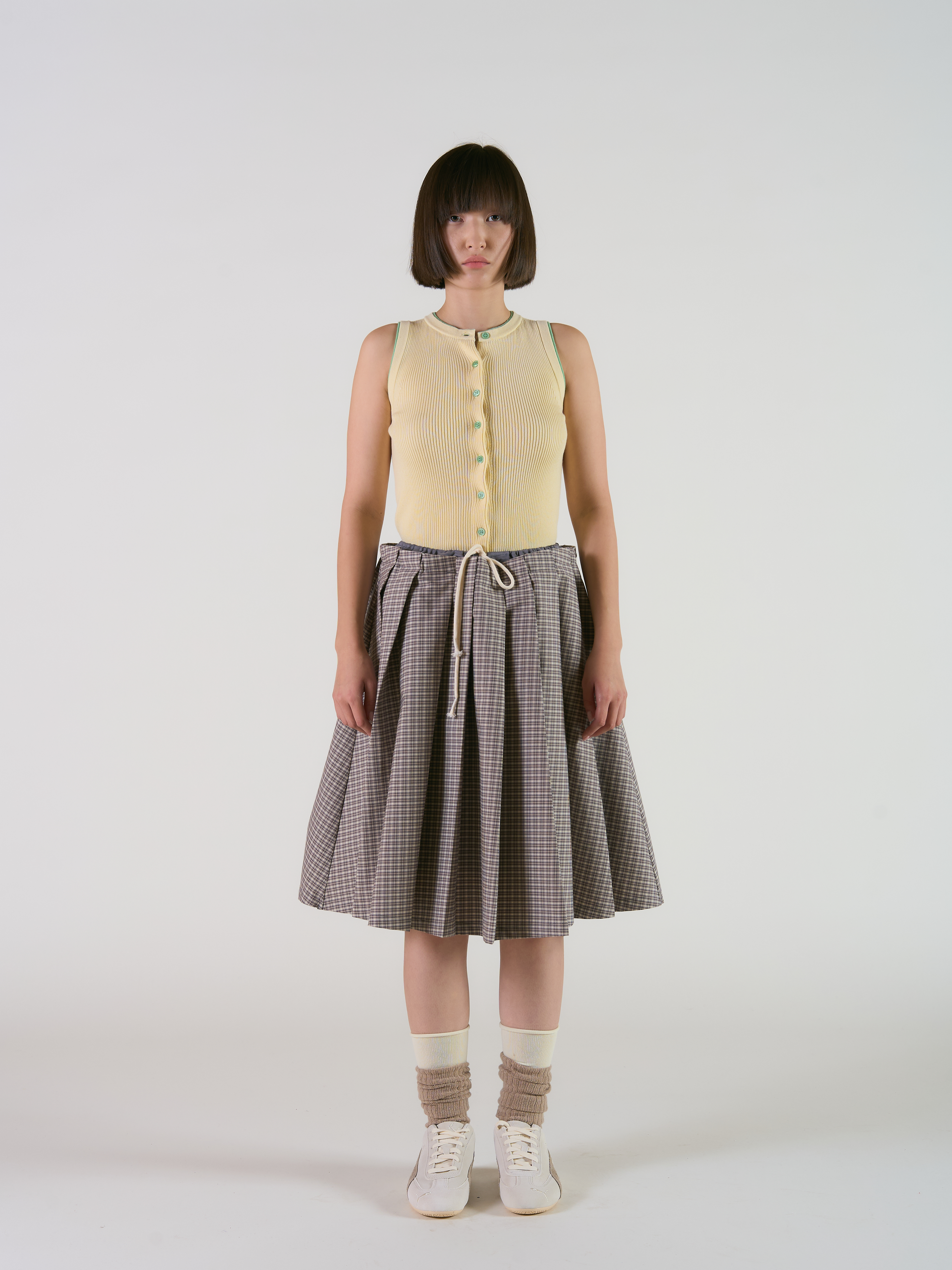 Юбка со складками, напоминающими школьную эстетику, длина чуть ниже колена. Юбка имеет двойной пояс с кулисками, благодаря которым можно регулировать обхват и создавать дополнительный объем. Также присутствует боковая скрытая молния. Крой колокольчик, имеет подклад. Параметры модели Рост: 164 см Грудь - 85 см, талия - 63 см, бедра - 93 см Размер на модели: XS