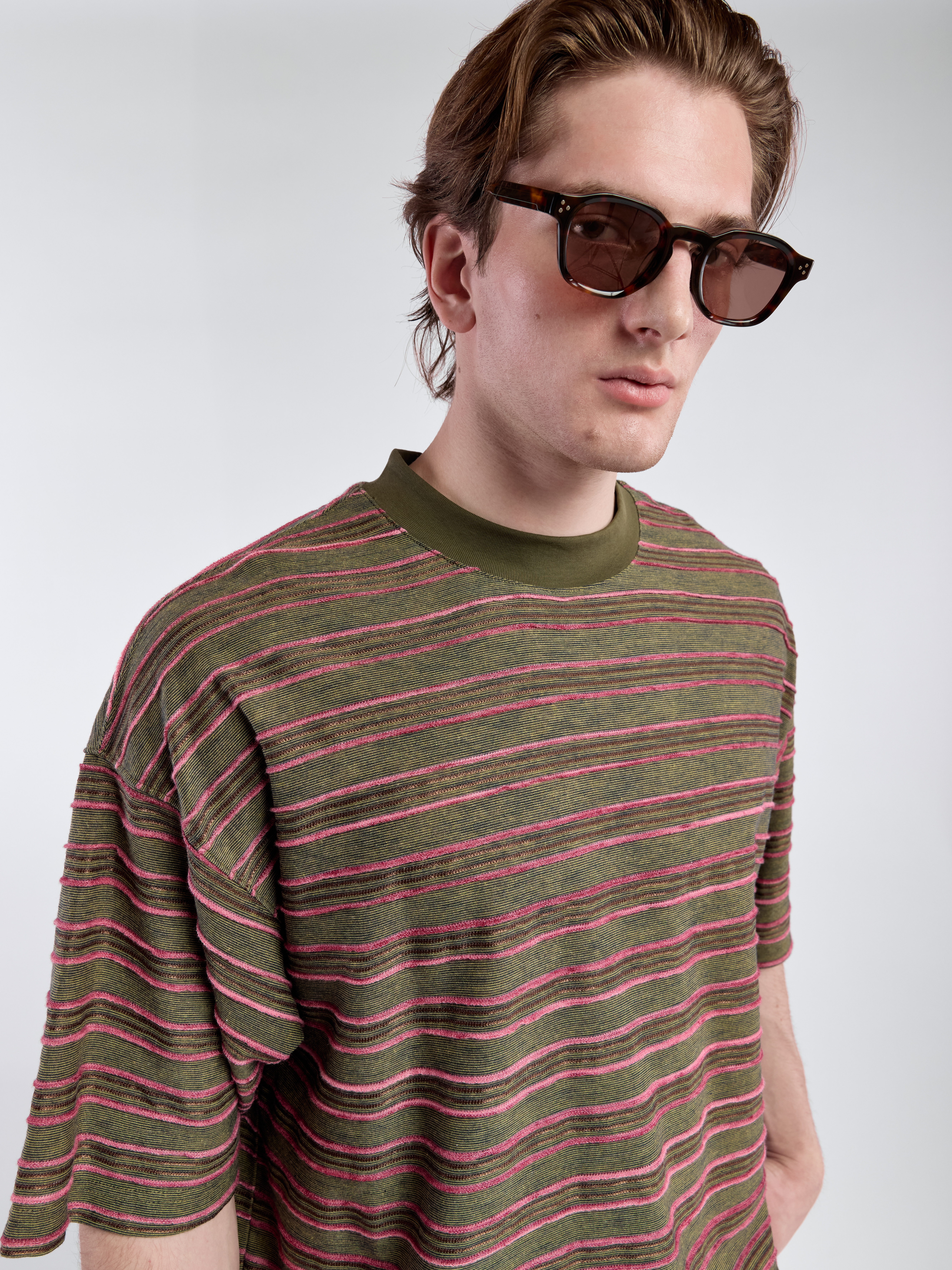 Футболка широкого кроя, удлиненного силуэта. Модель выполнена из смесового трикотажа в полоску, с фактурными линиями. Параметры модели Рост: 186 см Грудь – 100 см, талия - 73 см, бедра - 94 см Размер на модели: L