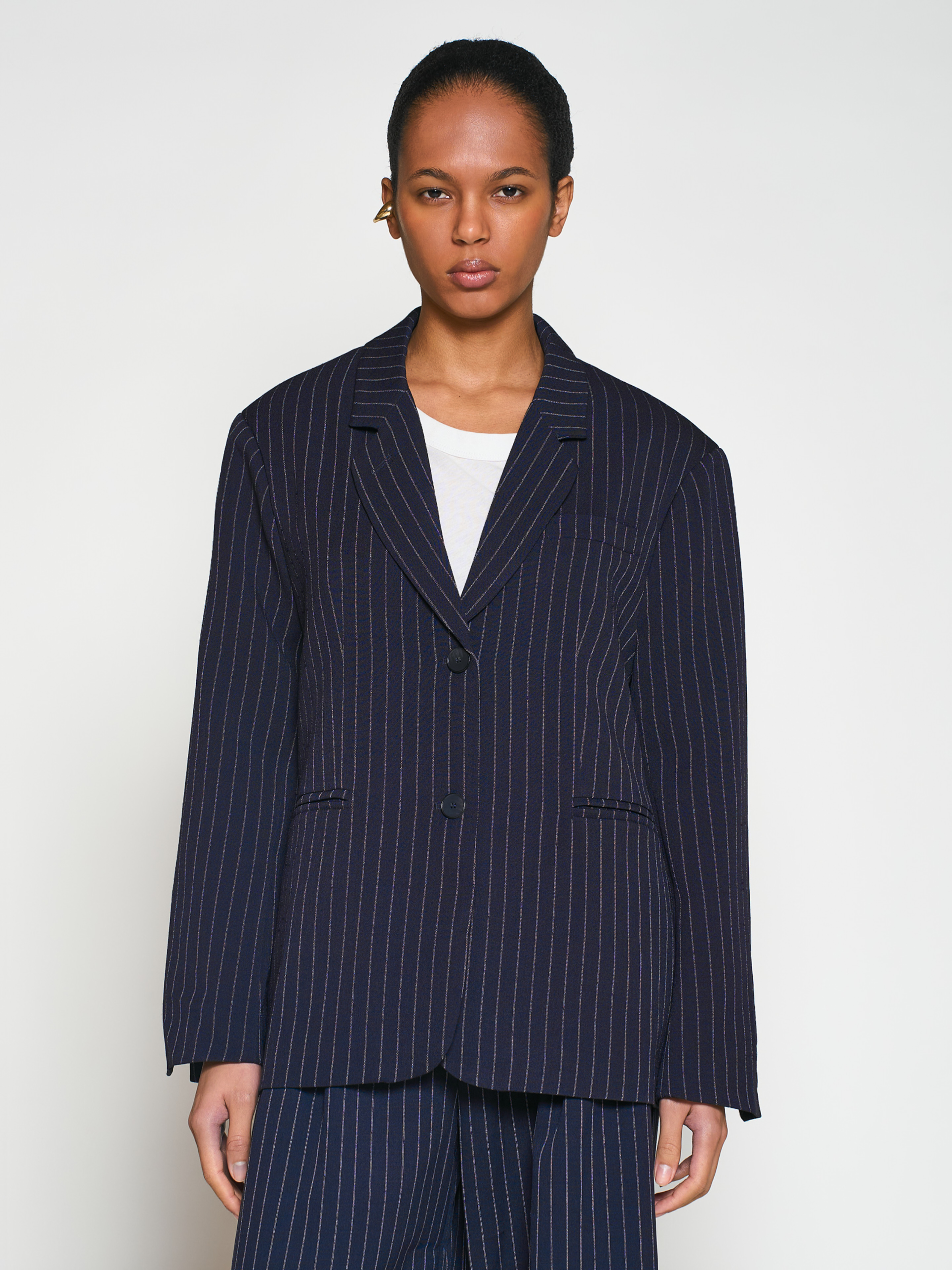 Пиджак Blue свободного кроя, прямого силуэта. Модель выполнена из струящейся костюмной ткани в белую полоску. Два передних кармана с клапанами и один нагрудный. Застегивается на две контрастные пуговицы. Для полноценного костюма отдельно можно приобрести брюки Blue. Параметры модели Рост: 175 см Грудь - 80 см, талия - 61 с м, бедра - 88 см Размер на модели: XS