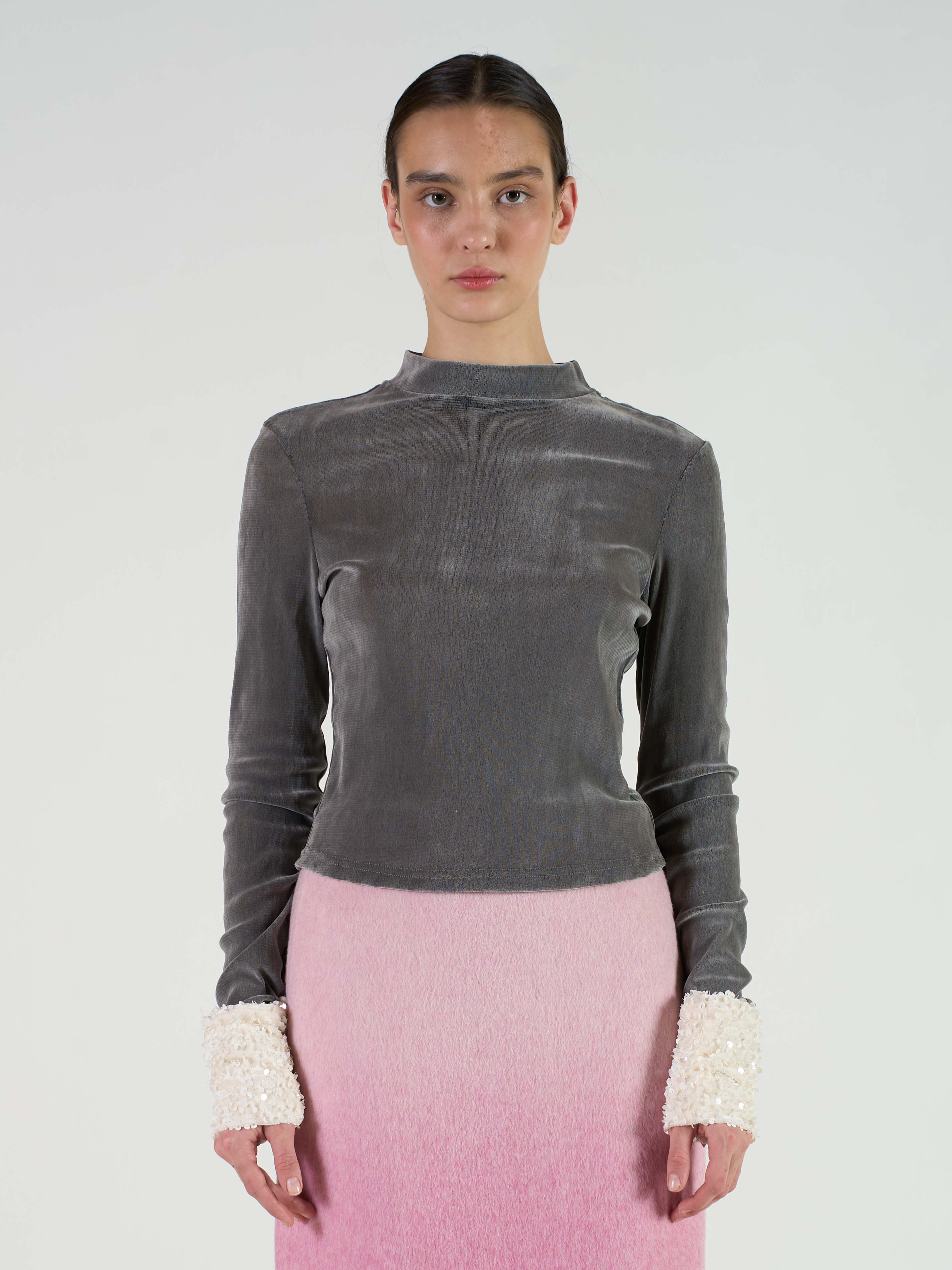 Бархатный лонгслив со съемными манжетами из пайеток.