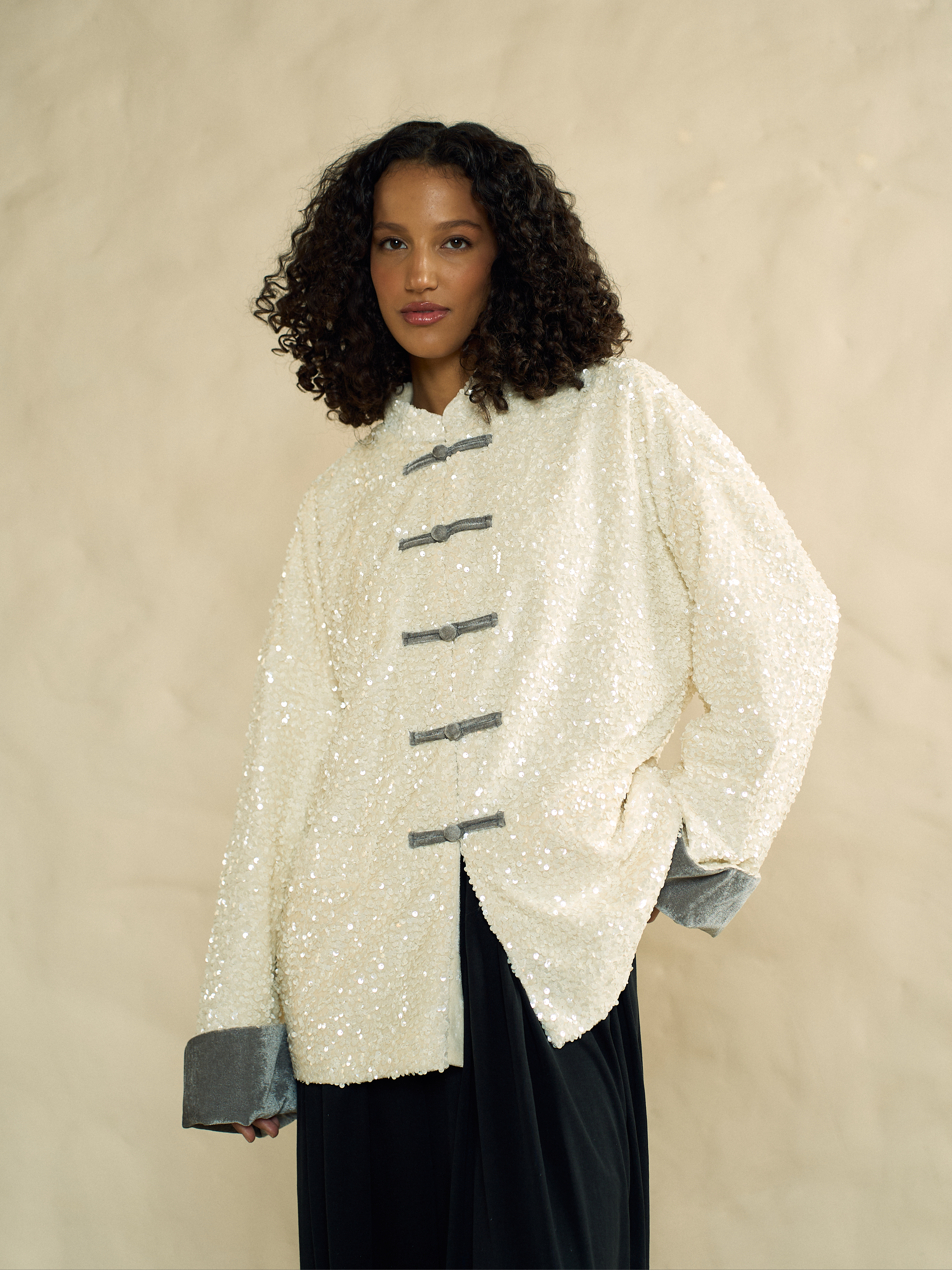 Пиджак-кимоно с пайетками в японском стиле на пуговицах. Пайетки и блестки придают ему особый шик и привлекательность. Выполнена из высококачественного материала, который обеспечивает комфорт в течение всего дня. Широкие длинные рукава создадут максимальный комфорт и свободу движений.