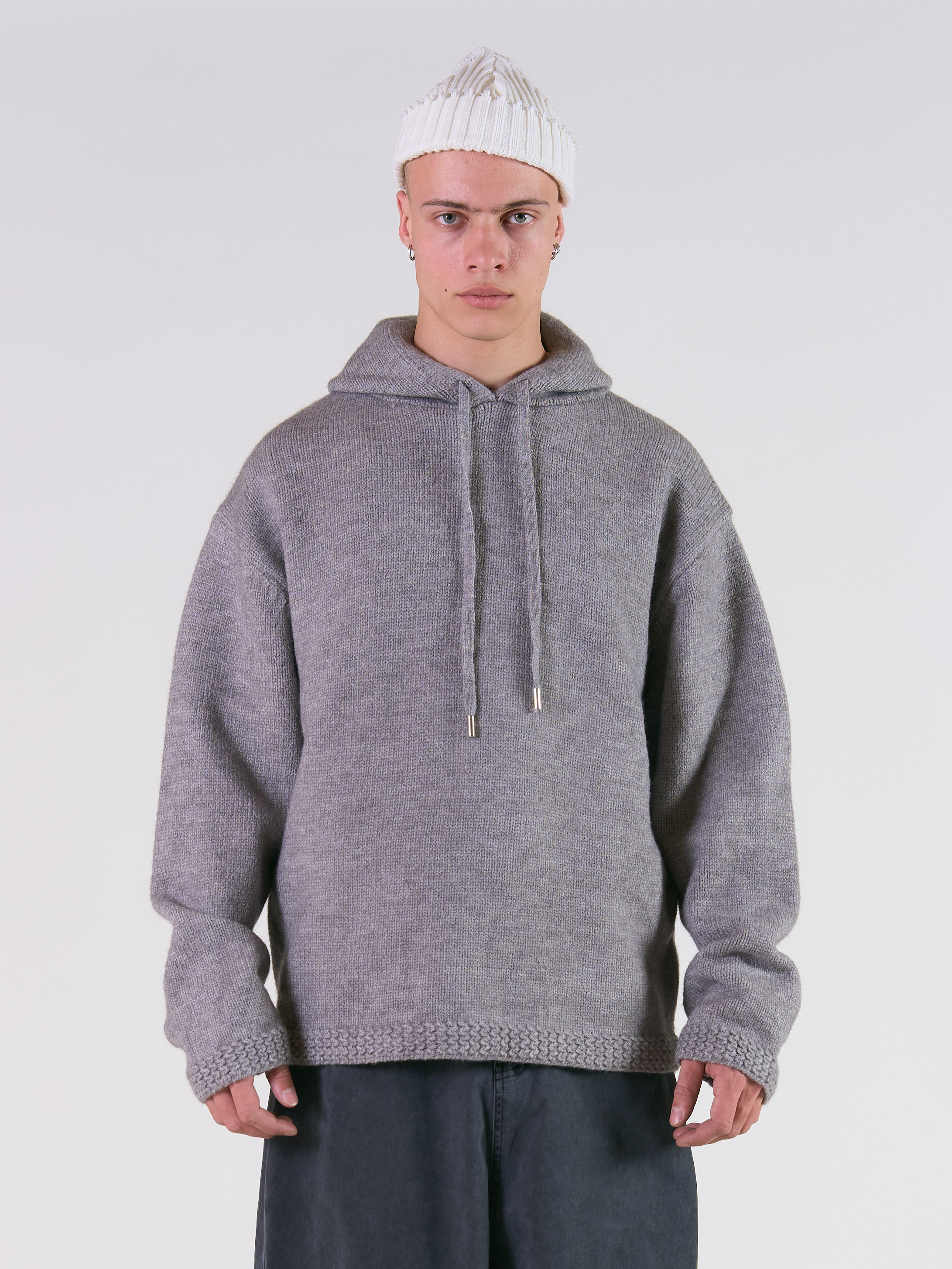 Вязанное худи с капюшоном свободного кроя, с фактурной окантовкой, спущенным плечом и шнуровкой.