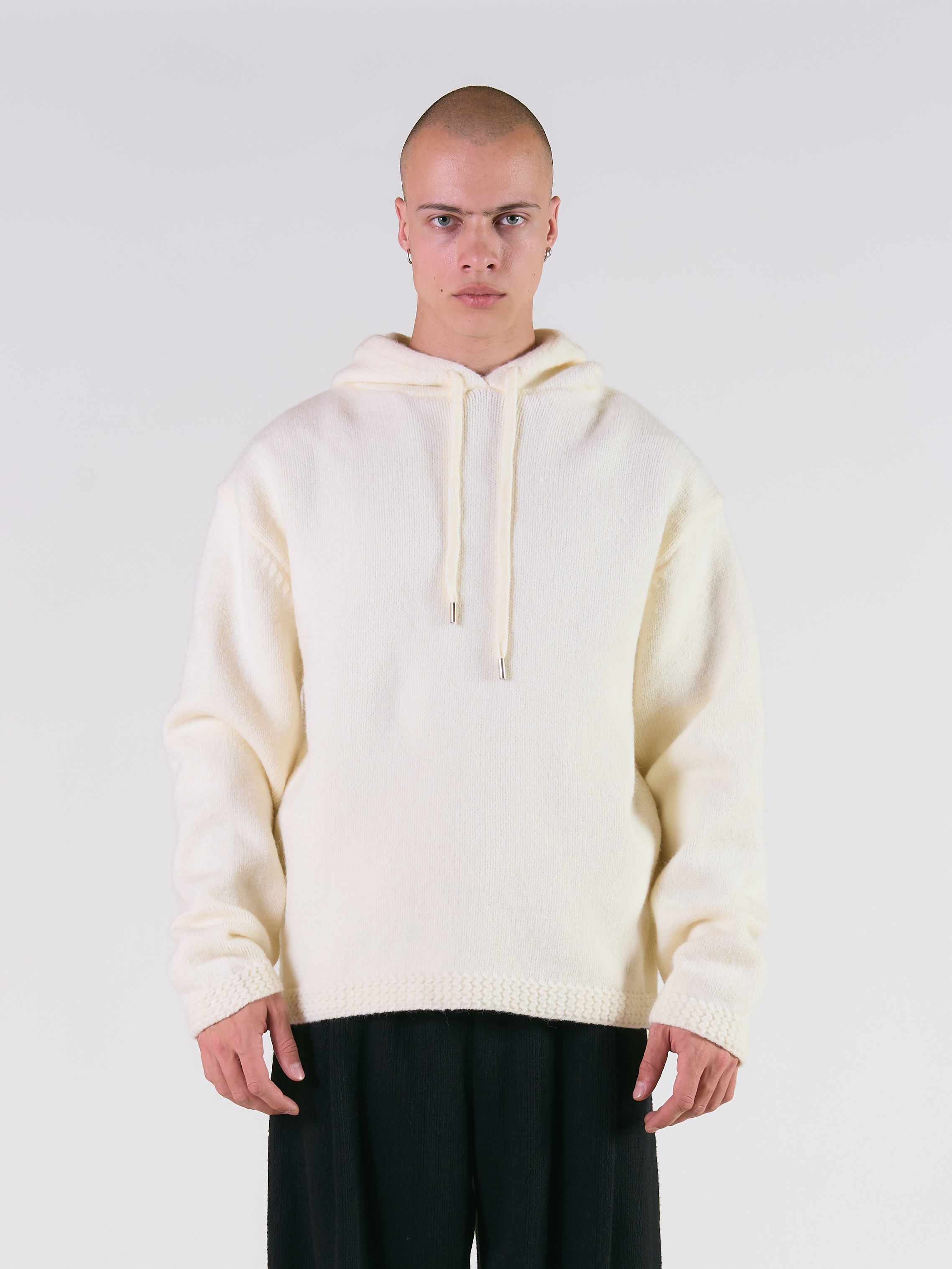 Вязанное худи с капюшоном свободного кроя, с фактурной окантовкой, спущенным плечом и шнуровкой.