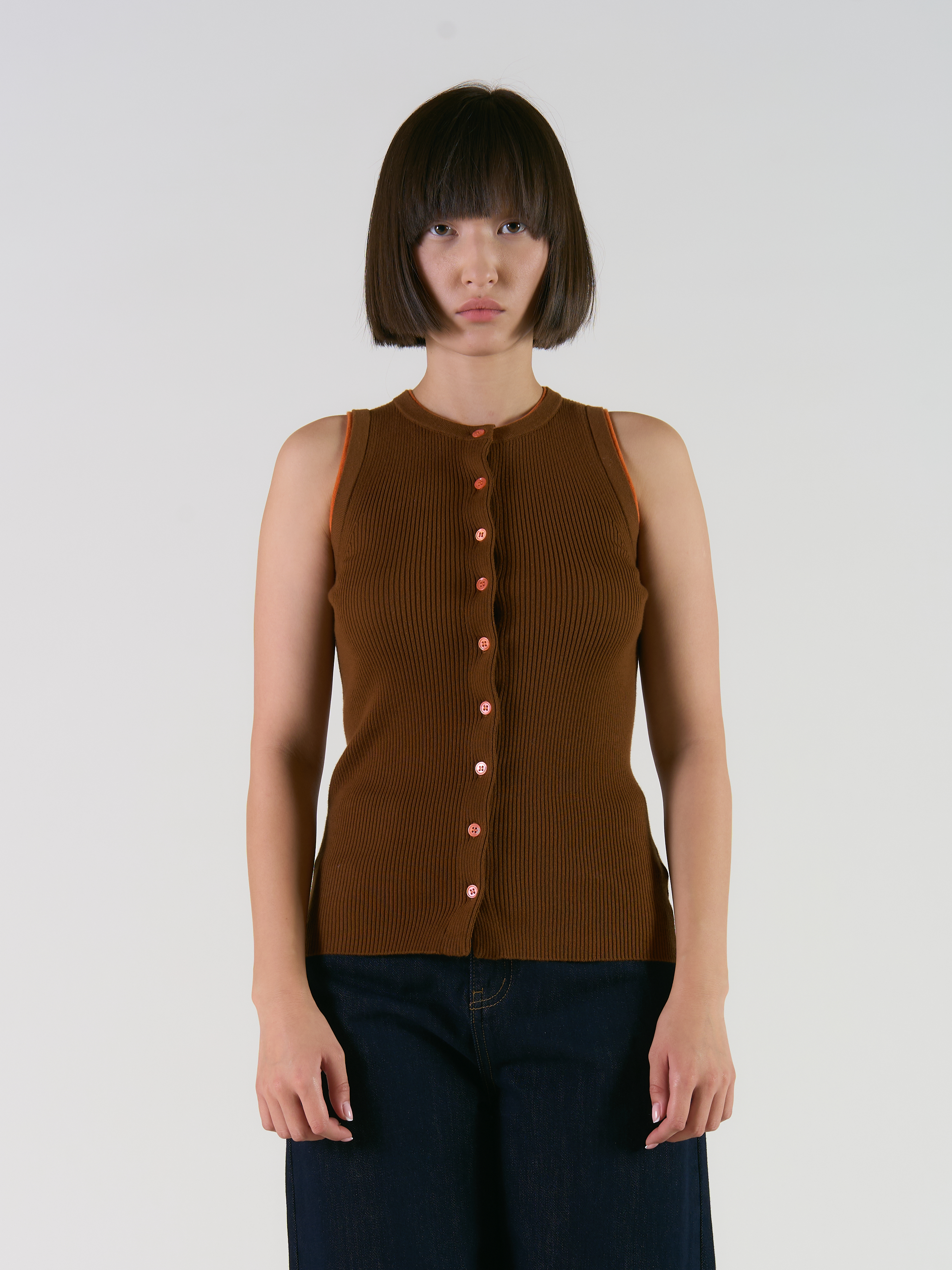 Майка Vest облегающего кроя, с эффектом многослойности благодаря контрастному второму слою. Выполнена из мягкой трикотажной ткани в рубчик. Благодаря функциональным пуговицам можно стилизовать майку как жилетку, надев на облегающий лонгслив. Параметры модели Рост: 164 см Грудь - 85 см, талия - 63 см, бедра - 93 см Размер на модели: XS